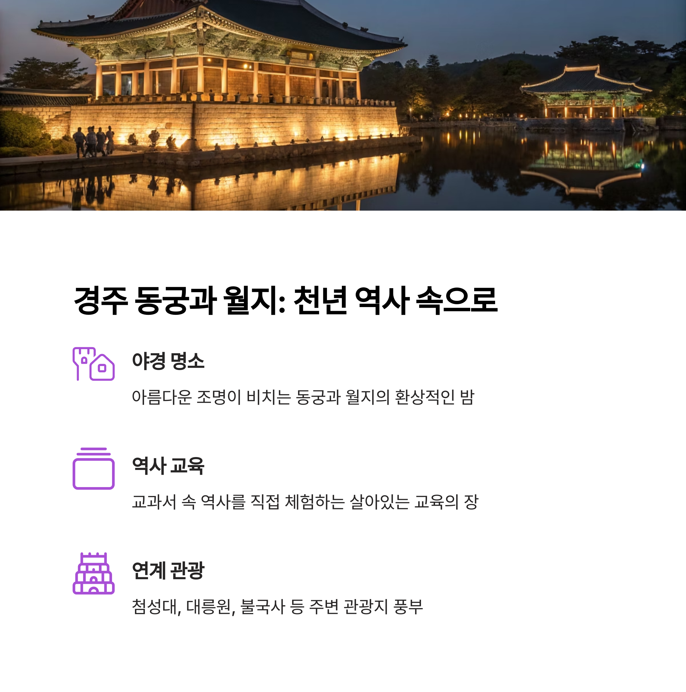 두 번째 추천지는 경주 불국사와 동궁과 월지입니다. 아이들에게는 교육적인 의미를, 어른들에게는 고즈넉한 감성을 선물해주는 장소죠. 넓고 평평한 동선으로 가족 단위 관람에 최적이며, 맛집도 근처에 많아 한 끼 식사도 즐겁습니다. 밤이 되면 조명이 켜진 동궁과 월지의 반영은 사진으로 남기기에 손색이 없는 아름다움입니다.