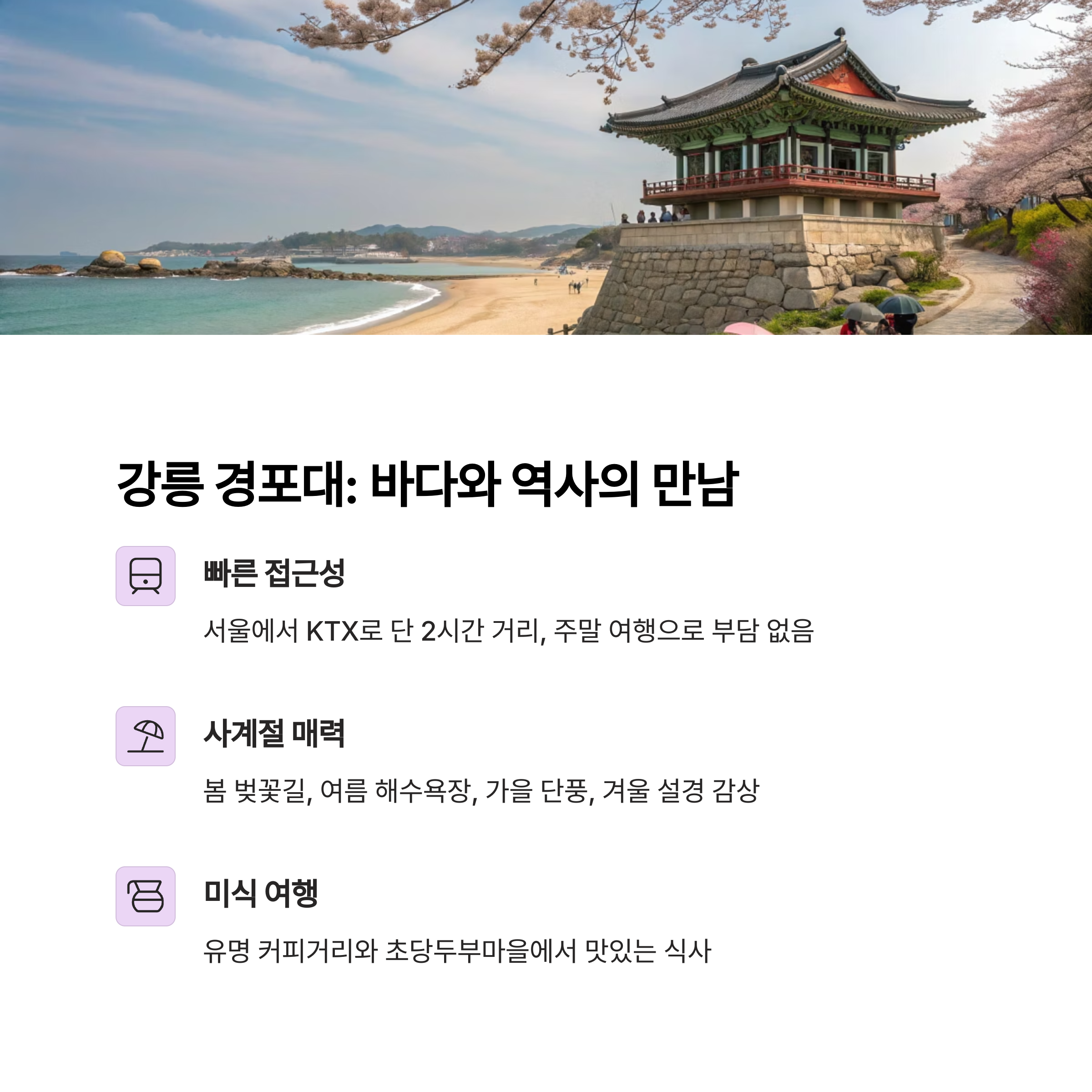 가족과 함께하는 여행은 소중한 시간을 공유하는 특별한 기회입니다. 강릉, 경주, 여수는 이동이 편리하고 볼거리도 풍성하며, 아이부터 어르신까지 모두가 만족할 수 있는 실속 코스로 자주 추천되는 지역입니다. 이번 추천 코스를 참고하여 여러분의 다음 여행이 더욱 즐겁고 의미 있는 시간이 되기를 바랍니다. 가족의 웃음이 가득한 하루, 이번 주말부터 떠나보시는 건 어떨까요?