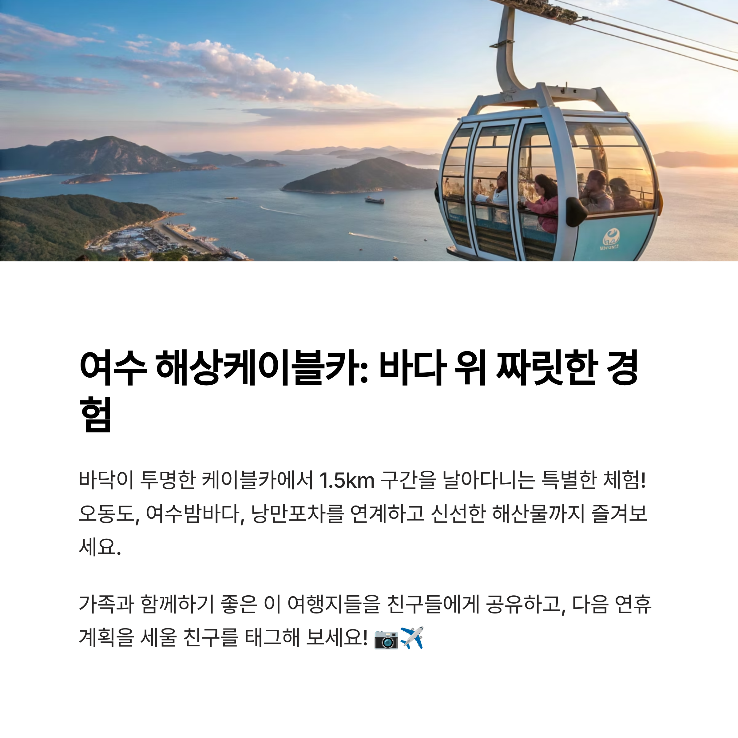 마지막 세 번째 코스는 여수 해상케이블카 + 아쿠아플라넷입니다. 바다 위를 건너는 케이블카는 남녀노소 모두에게 신선한 경험을 선사하며, 아쿠아플라넷에서는 해양생물과 체험 전시가 아이들에게 큰 즐거움을 줍니다. 여수 밤바다와 낭만적인 분위기까지 더해져 가족 모두의 만족도가 높은 여행지로 손꼽힙니다.