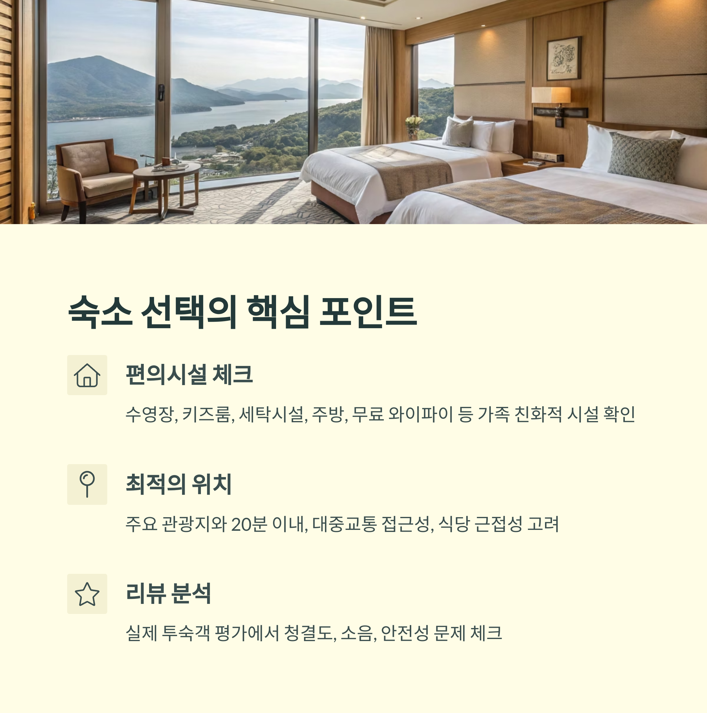 가족 여행의 성공은 숙소와 교통편 선택에 달려있습니다. 특히 아이나 노약자가 포함된 여행일 경우, 숙소는 엘리베이터 유무, 조식 제공 여부, 주변 편의시설 접근성을 반드시 확인해야 합니다. 교통 또한 대중교통 위주인지 렌터카 중심인지 사전에 결정하고, 지역별 이동 동선을 고려한 예약이 필요합니다. 단순히 저렴한 가격만 보고 예약하는 것은 오히려 전체 여행의 피로도를 높일 수 있습니다. 목적지와 숙소 간 거리, 체크인 시간 등 작은 디테일 하나까지 신경 써야 가족 모두가 만족하는 여행이 완성됩니다.