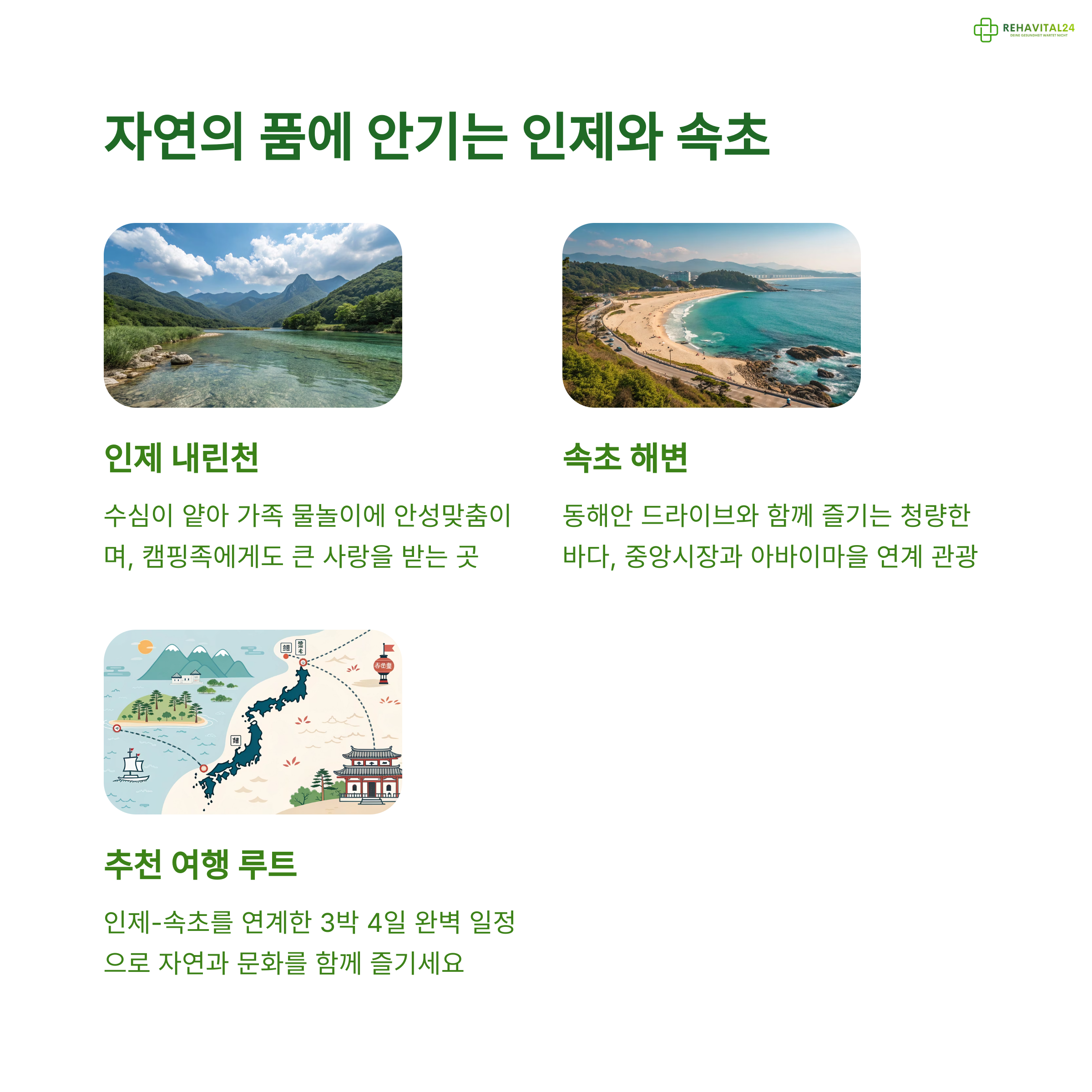 국내 여행지로는 강원도 인제와 속초가 꾸준히 인기입니다. 시원한 계곡과 바다가 함께 있는 구조로 가족 단위나 커플 여행객에게 모두 사랑받는 지역입니다. 접근성도 좋아 자차나 대중교통 모두 편리하며 숙소나 맛집도 많아 여행 만족도가 높습니다. 특히 속초는 푸드트립과 풍경이 함께 있는 매력적인 도시로 추천합니다. 짧은 일정이라면 하루 당일치기 코스로도 충분하고, 여유롭게 1박 2일 이상 머물기에도 적합합니다. 날씨가 더워질수록 바다와 계곡이 있는 장소가 더욱 각광받는다는 점을 참고해주세요.