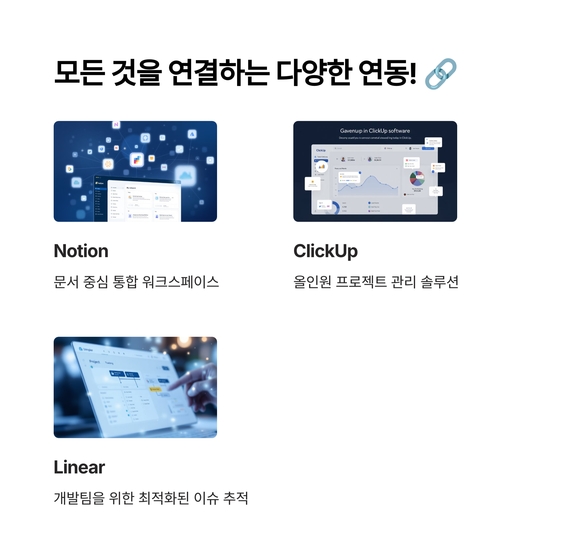 대표적인 협업툴로는 Notion, Slack, ClickUp, Microsoft Teams, 그리고 요즘 급부상 중인 Linear가 있습니다. Notion은 문서와 프로젝트 관리를 동시에 처리할 수 있어 다양한 팀에서 선호되고 있으며, ClickUp은 일정, 할일, 커뮤니케이션을 하나로 통합해주는 기능이 탁월합니다. 특히 Linear는 깔끔한 UI와 개발 중심의 기능으로 기술 기반 팀에서 빠르게 채택되고 있으며, 다양한 AI 플러그인 연동으로 확장성이 뛰어납니다.