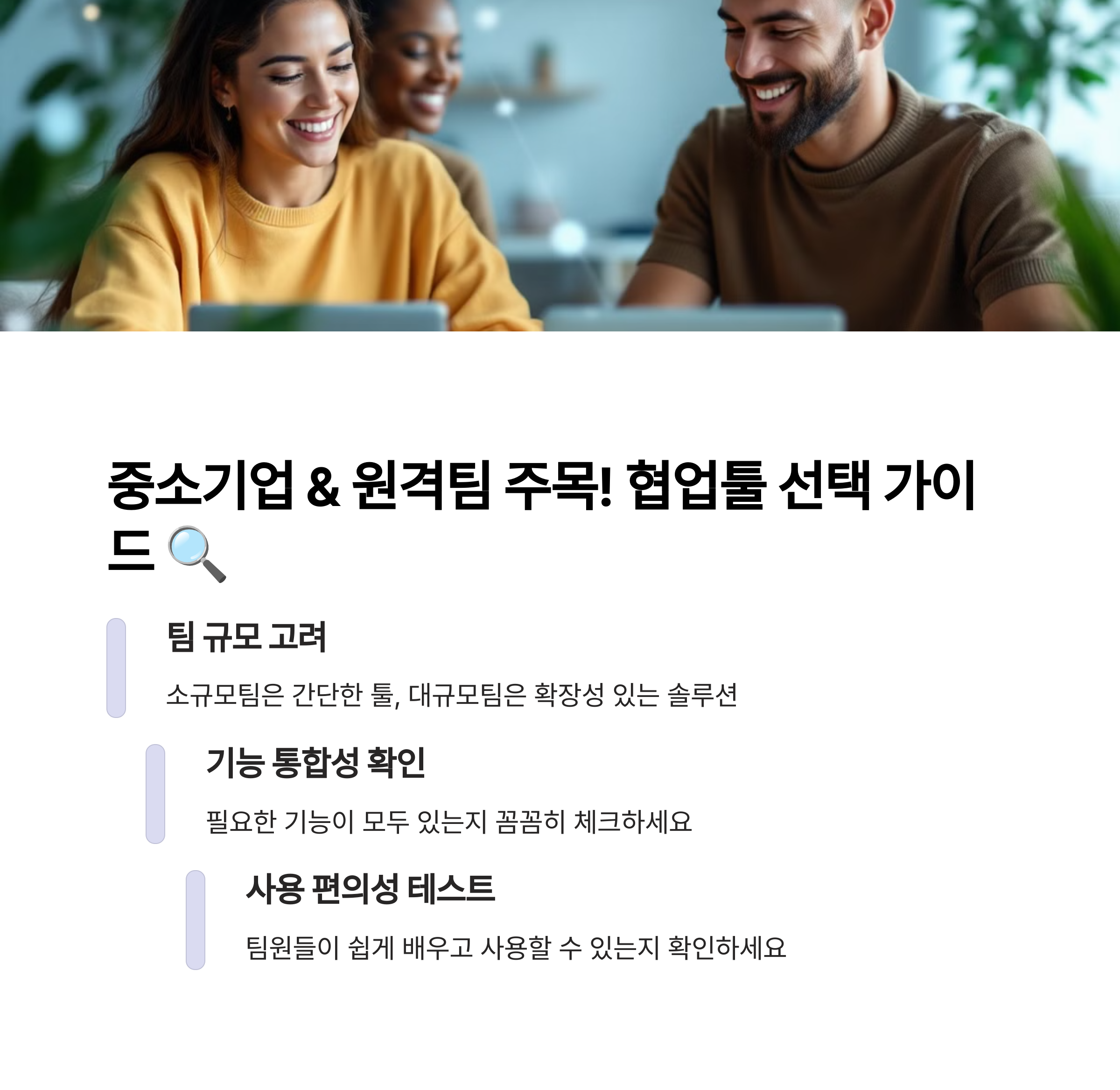 협업툴 선택 시에는 1. 팀 규모와 업무 유형, 2. 사용자 편의성, 3. AI 통합 정도, 4. 외부 툴과의 연동성, 5. 보안 기능을 꼼꼼히 살펴보아야 합니다. 도구 자체의 기능보다도 우리 팀에 얼마나 자연스럽게 녹아들 수 있는지, 사용자가 쉽게 적응할 수 있는지가 성공적인 협업툴 도입의 핵심입니다.