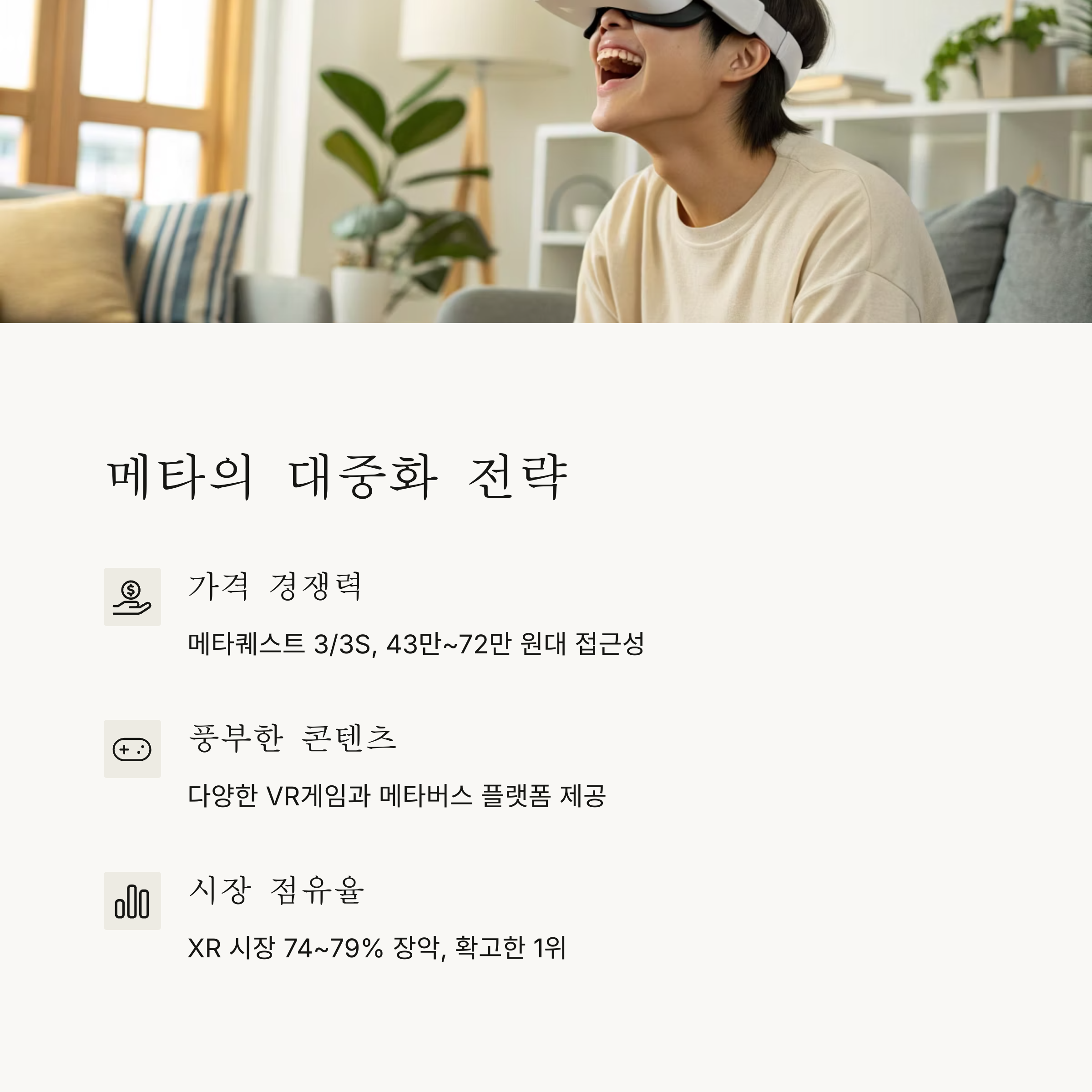 메타와 애플 모두 XR 시장을 차세대 성장 동력으로 삼고 있으며, 각각 다른 전략으로 접근하고 있습니다. 메타는 접근성 중심의 대중화 전략을, 애플은 프리미엄 시장을 겨냥한 고급화를 택했습니다. 결국 승패는 기술 완성도와 사용자 경험, 그리고 생태계 구축에 달려있을 것입니다.