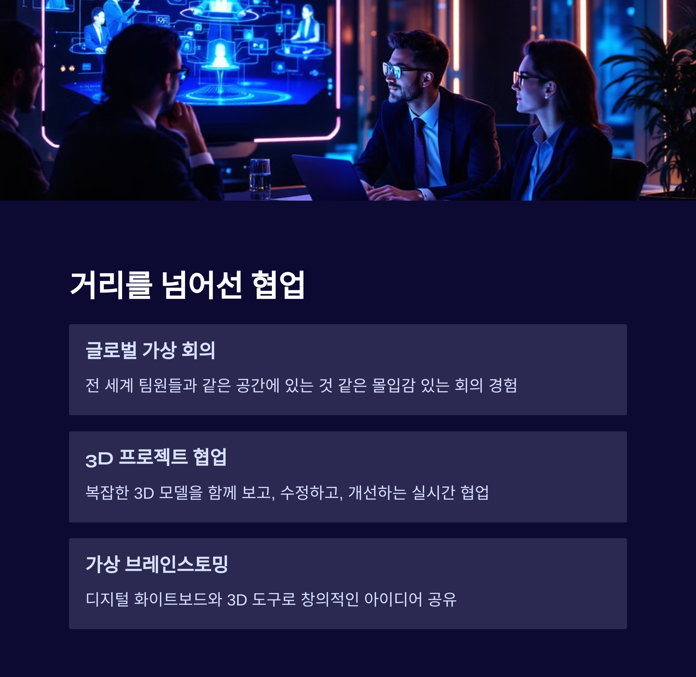 | 엔터테인먼트 외 교육·의료 활용 기대 | 메타버스, 실시간 협업 시스템과 연계 | 몰입형 콘텐츠로 사용자 경험 강화 |