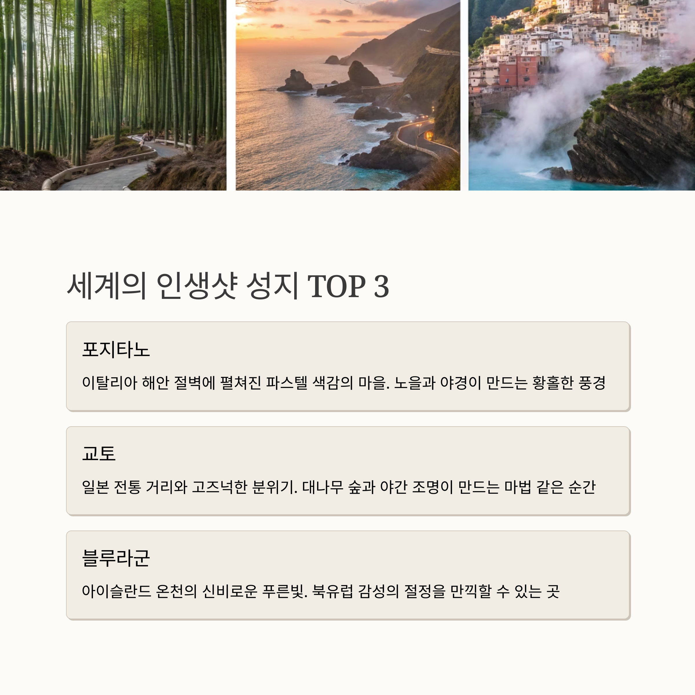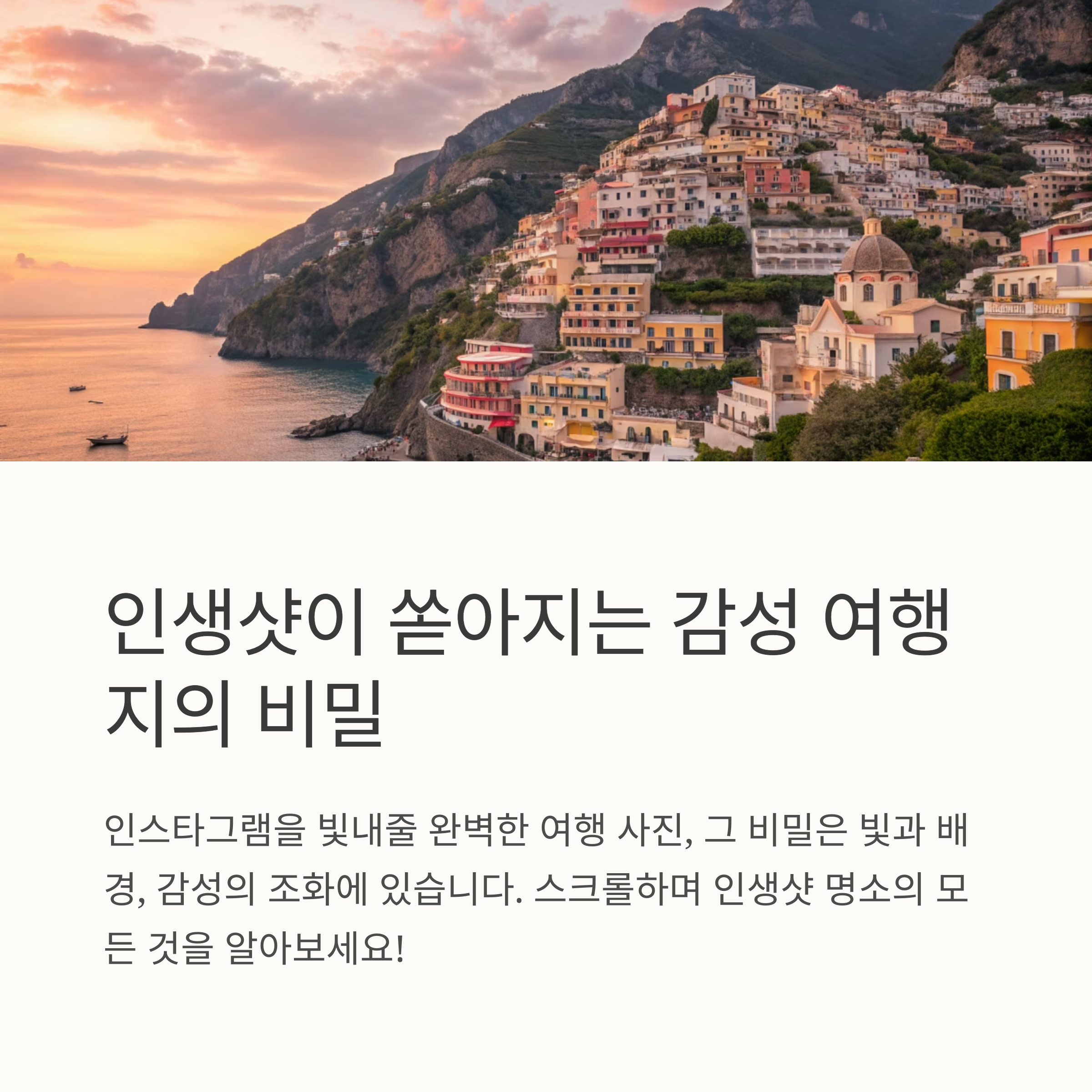 | 감정이 담긴 구도와 배경이 핵심입니다. | 자연광, 색감, 적은 인파가 중요 요소입니다. | 포지타노, 교토, 블루라군 등 추천됩니다. |
