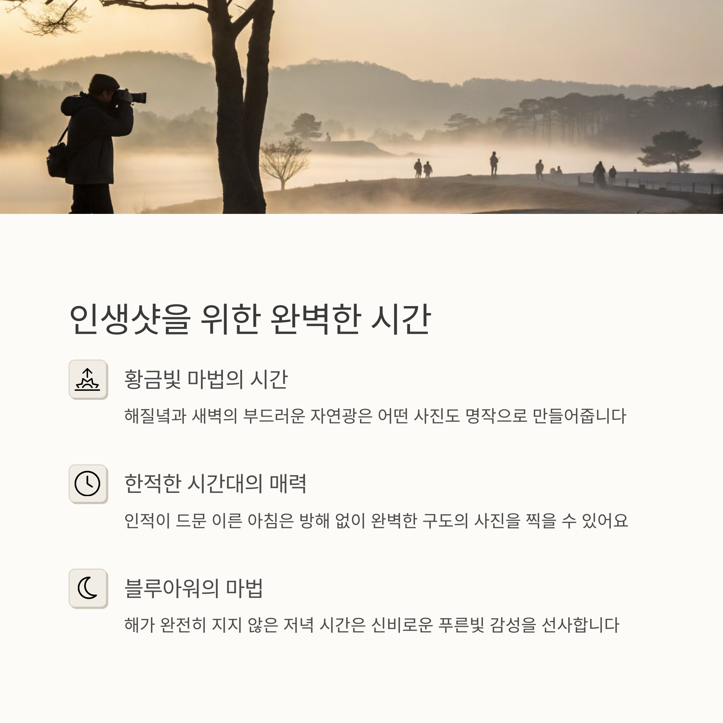 | 감성적 배경은 SNS 반응도 높습니다. | 해질녘과 이른 아침 시간대가 적기입니다. | 지역 특색이 잘 드러나는 곳이 좋습니다. |