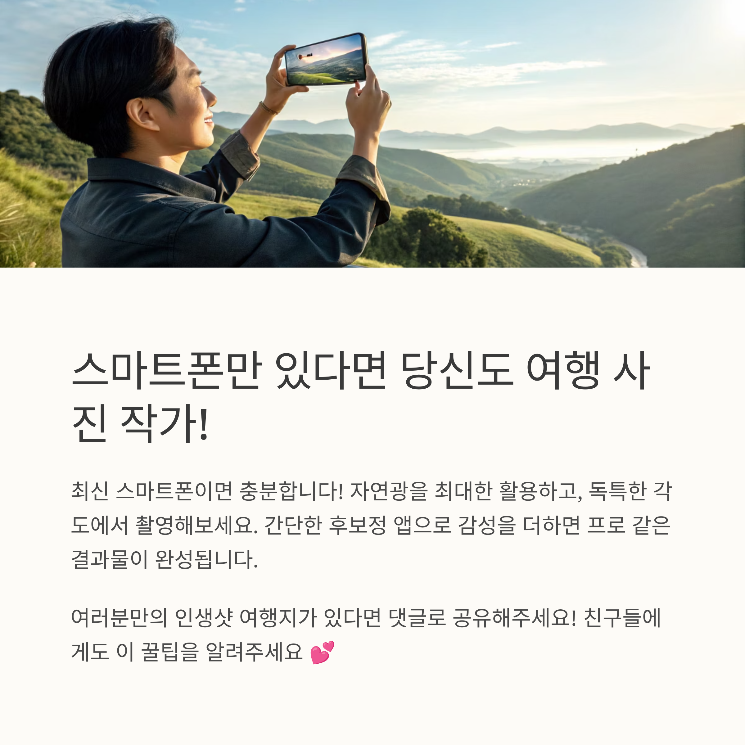 여러분이 여행 중 가장 멋진 사진을 찍었던 장소는 어디였나요? 사진 촬영 팁이나 인생샷 장소를 댓글로 공유해보세요! 다른 분들께도 큰 도움이 될 수 있습니다.