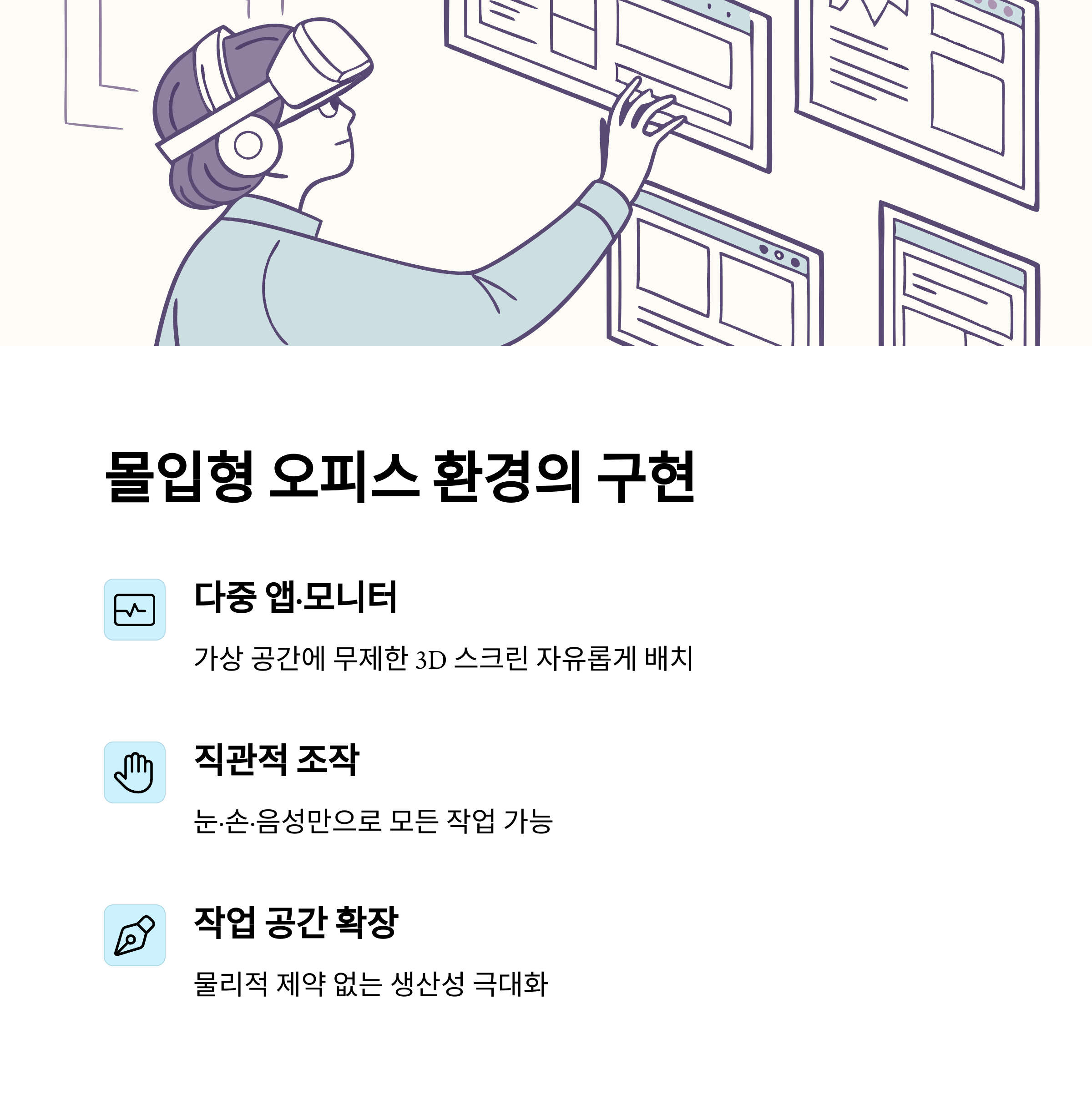 | 사용자의 손짓과 시선으로 인터페이스 제어 | 업무와 삶의 균형을 반영한 디지털 공간 | 재택, 하이브리드 근무에 최적화된 환경 |