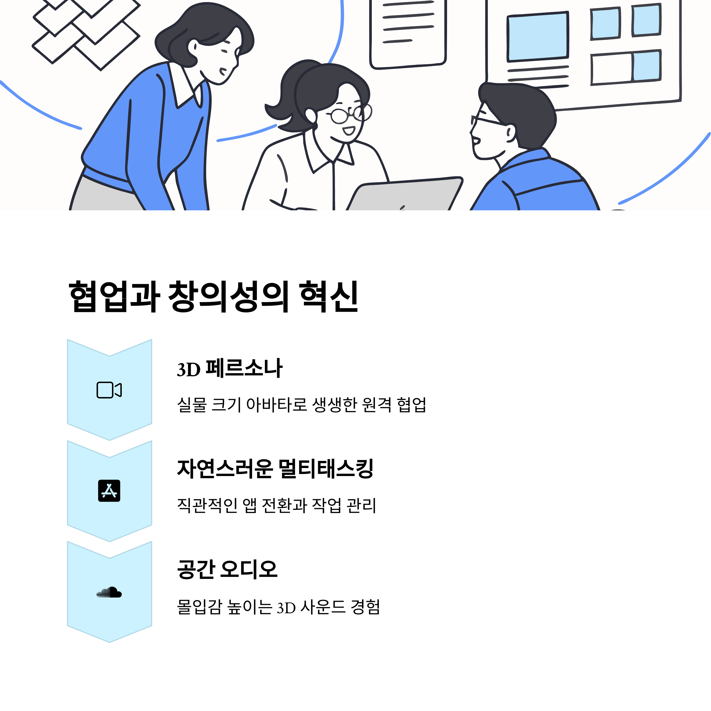 | 물리 공간과 디지털을 연결하는 기술 | 몰입과 집중을 높이는 스마트 오피스 구성 | 공간 제약 없이 실시간 공동 작업 가능 |