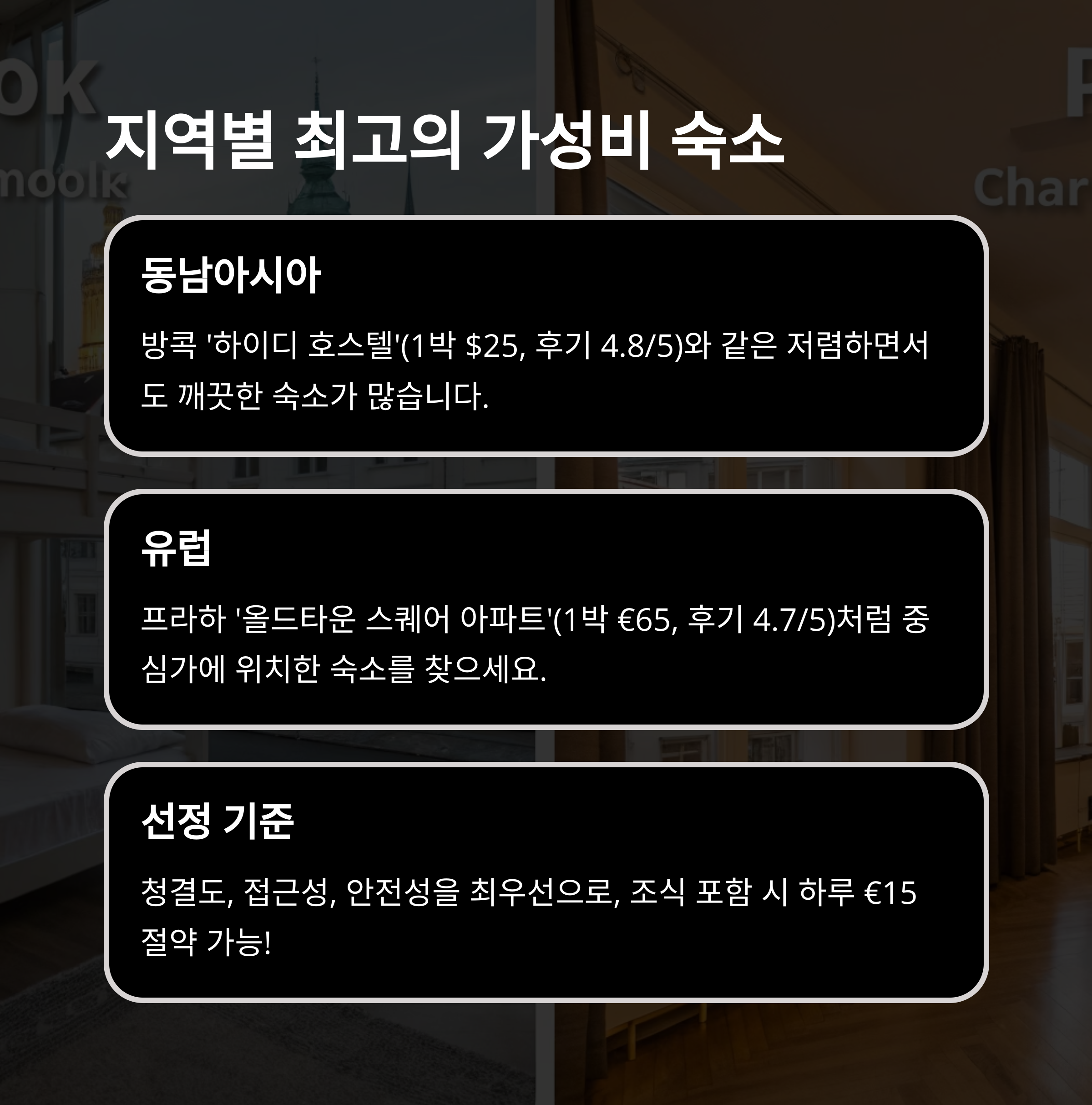 | 가성비 숙소 기준 | 가격과 후기를 바탕으로 최상의 숙소 선별 |