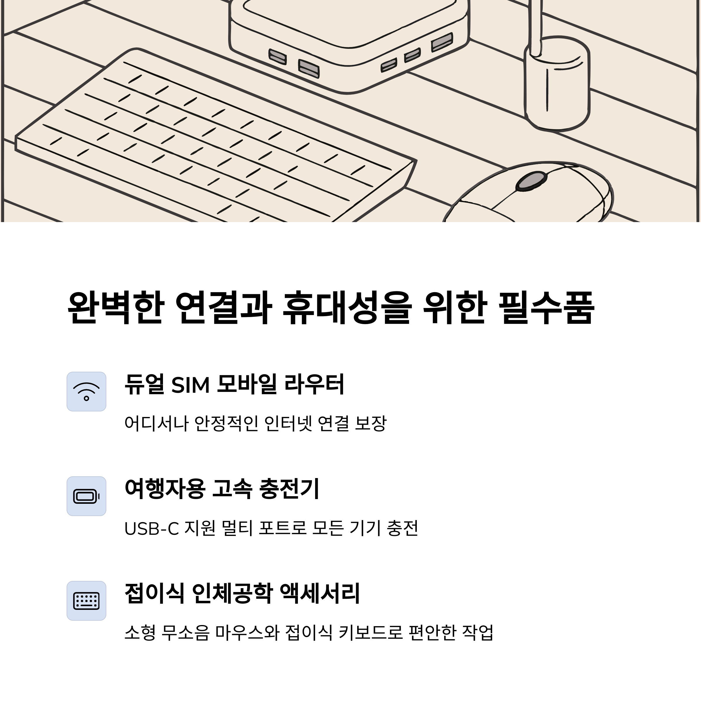 | 맥북에어, 그램, 서피스 등 경량 모델 | 휴대용 라우터, eSIM, 글로벌 유심 | 충전기, 허브, 블루투스 키보드/마우스 |