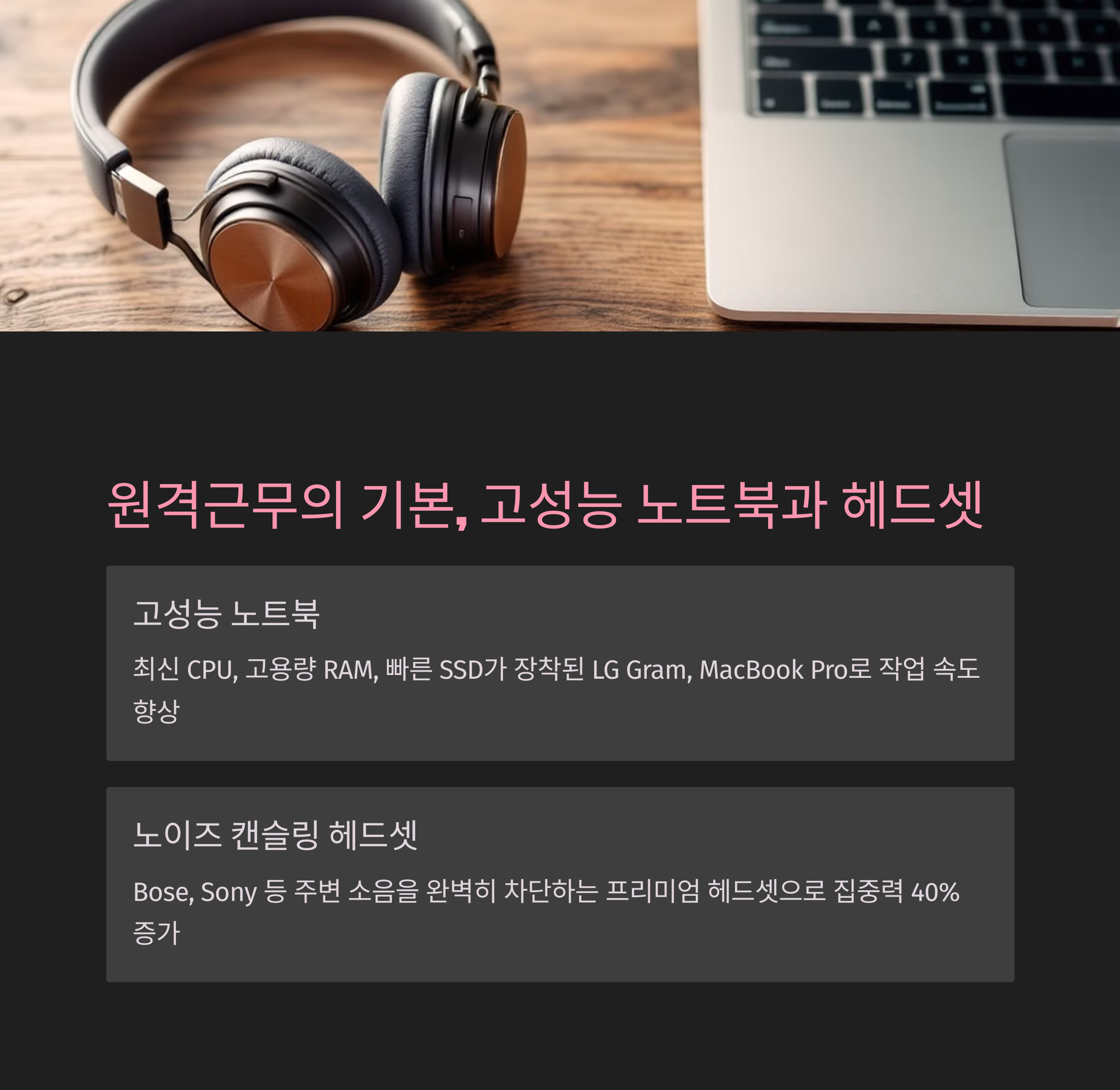 | 노이즈 캔슬링 헤드셋 | 주변 소음을 차단해 회의 및 집중도 향상 |