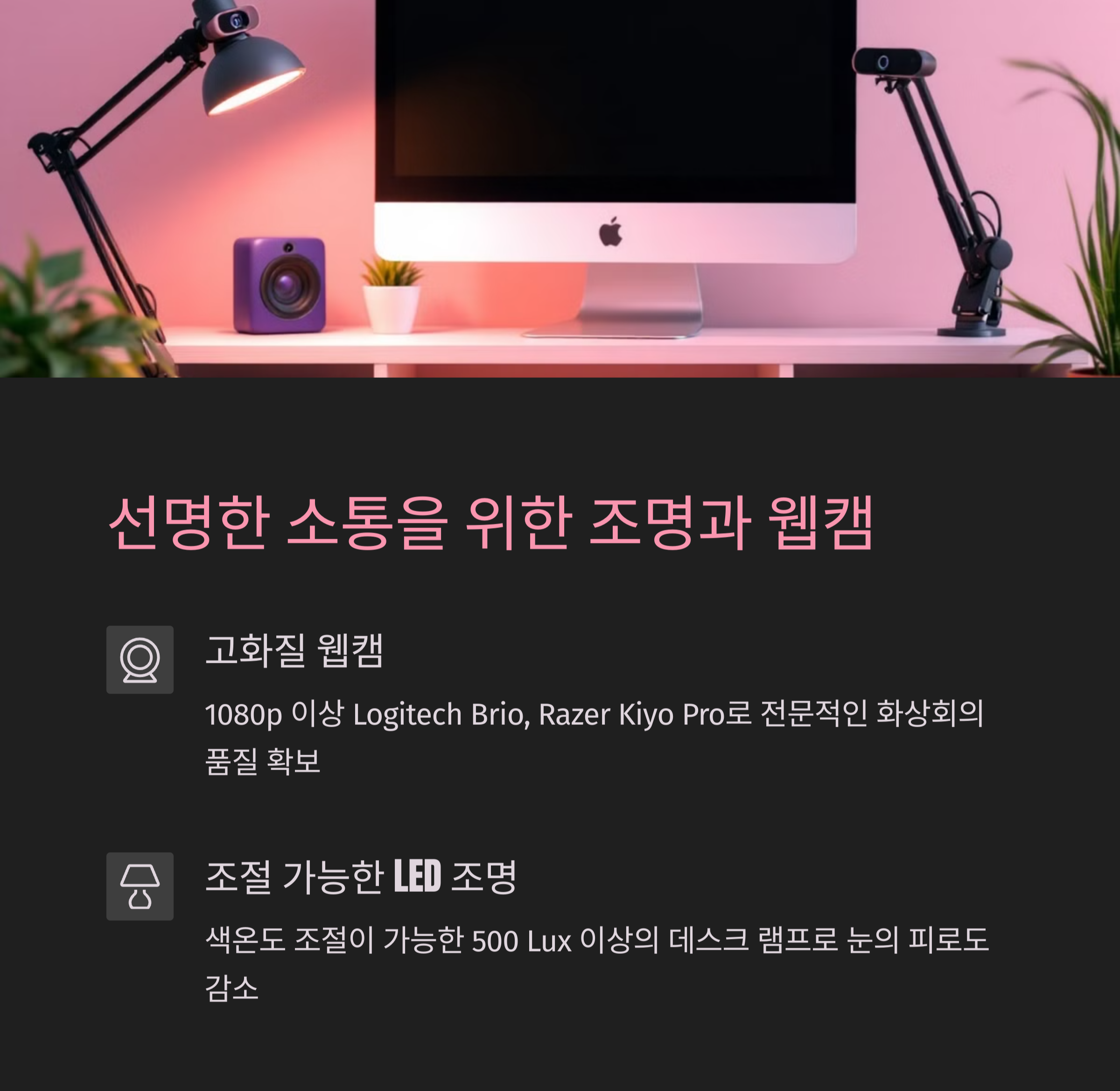 최근에는 화상 회의 전용 웹캠, 인체공학 키보드, 조명 시스템 등도 필수 장비로 각광받고 있습니다. 특히 조도 센서 기반 자동 밝기 조절 조명은 피로도를 줄이고 화면의 색 왜곡을 방지하는 데 효과적입니다. 원격근무 장비는 더 이상 단순한 소모품이 아닌 업무 몰입도를 결정짓는 경쟁력으로 작용하고 있습니다.