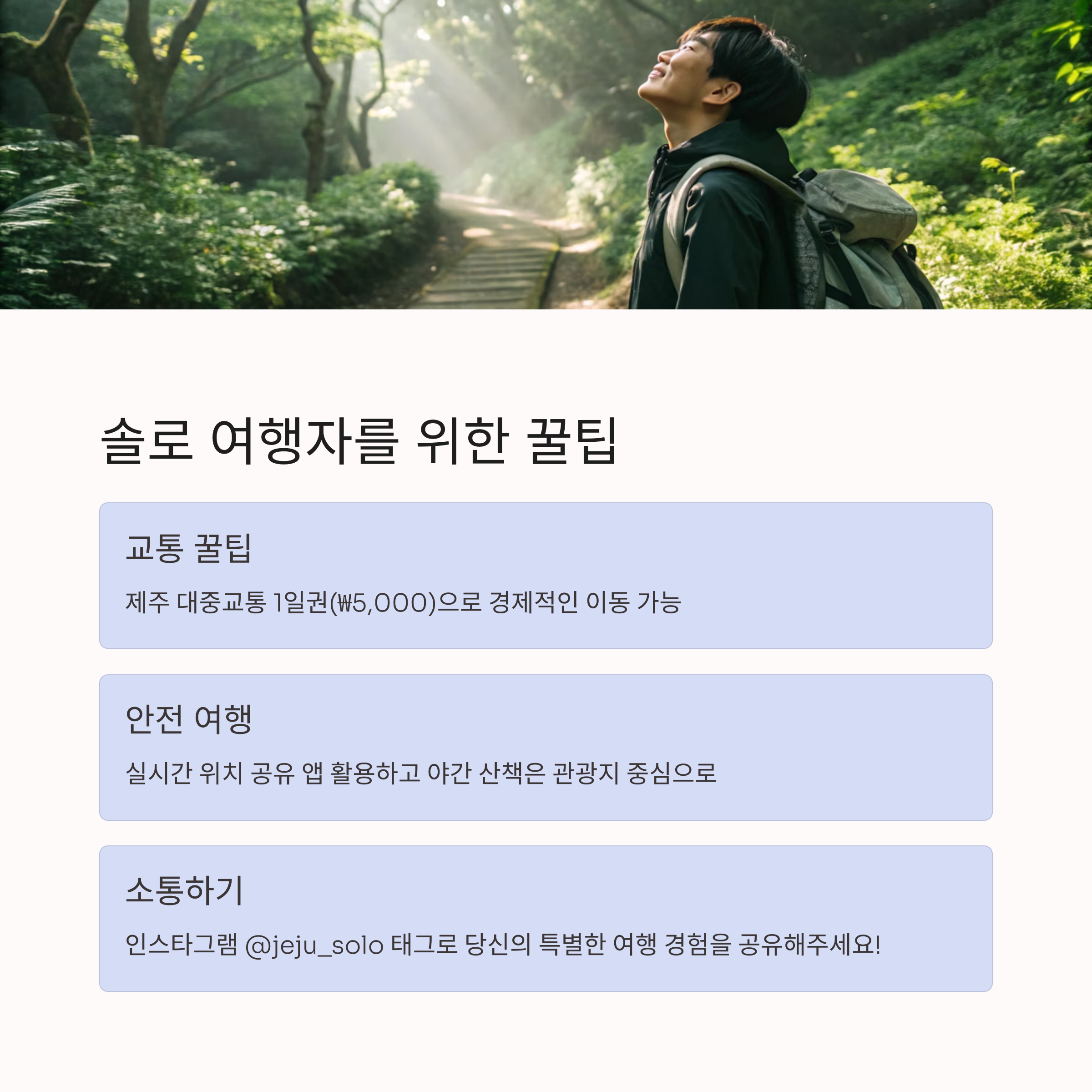 혼자 떠났던 제주 여행에서 가장 기억에 남는 장소는 어디인가요? 혼행 팁이나 추천 코스를 댓글로 나눠주시면 다른 분들에게도 큰 도움이 됩니다!