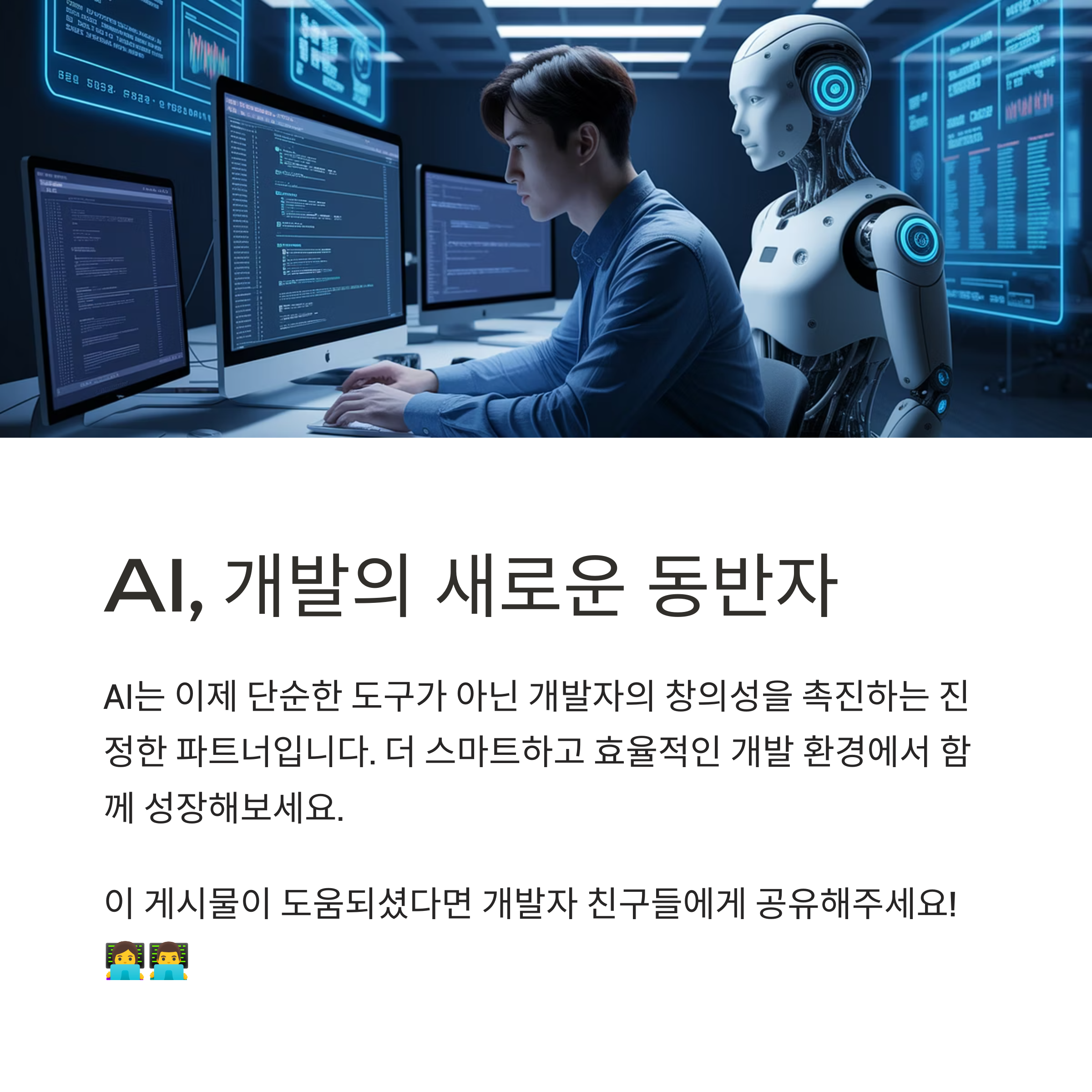 AI와 함께하는 개발자의 하루는 단지 기술 도구의 활용을 넘어, 새로운 일의 방식에 적응하고 더 나은 가치를 만들어내는 과정입니다. 자동화된 프로세스 속에서도 사람만이 할 수 있는 창의적인 판단과 따뜻한 협업은 여전히 중심에 있어야 하며, 그것이 바로 AI 시대 개발자가 나아갈 방향이기도 합니다. 기술은 변하지만, 기술을 대하는 우리의 태도는 그 이상으로 중요합니다. AI와의 공존이 더 이상 먼 미래가 아닌 지금, 현명하게 활용하고 유연하게 받아들이는 자세가 그 어느 때보다 필요합니다.