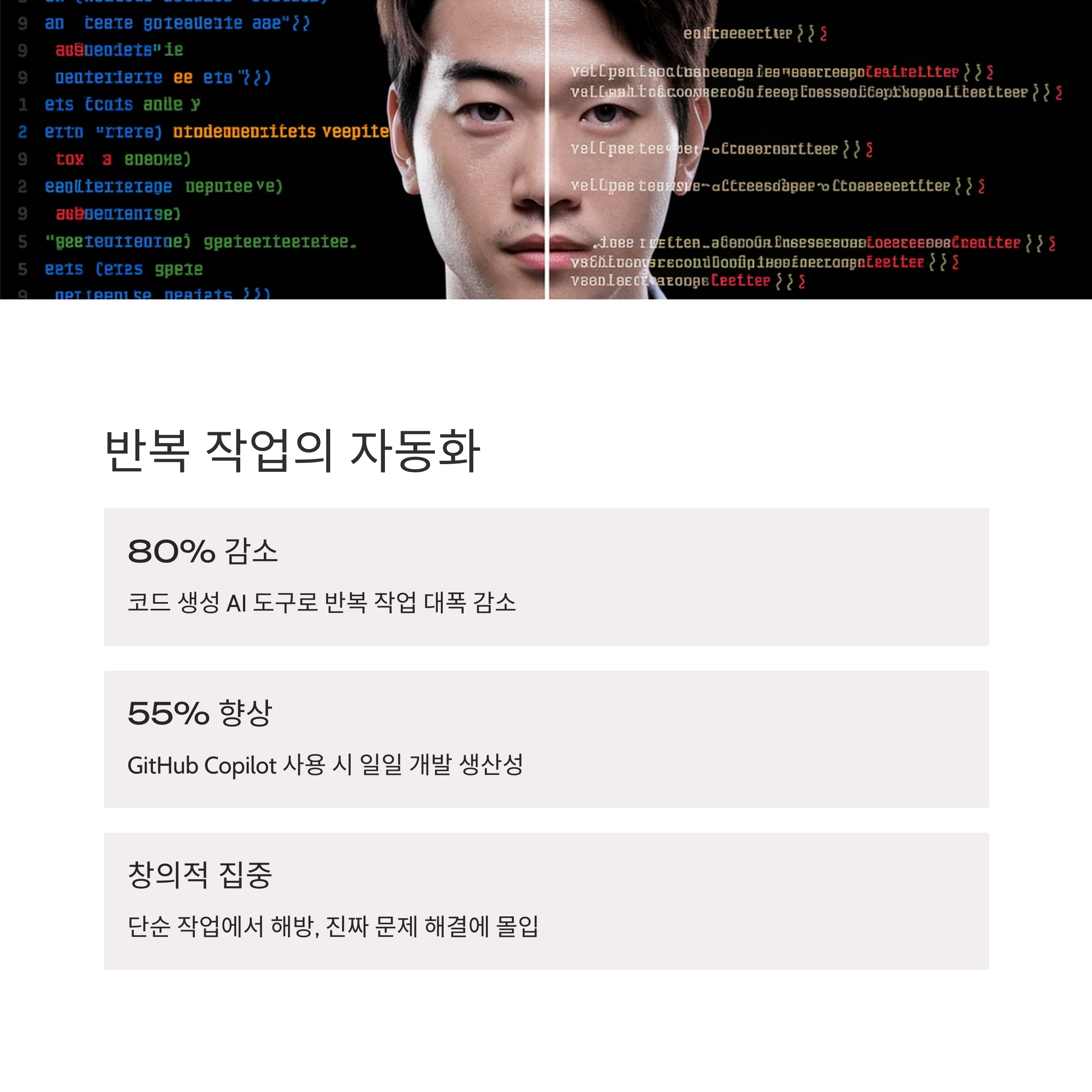 | 협업 방식 변화 | AI와 팀워크를 이루는 시대가 도래했습니다. |