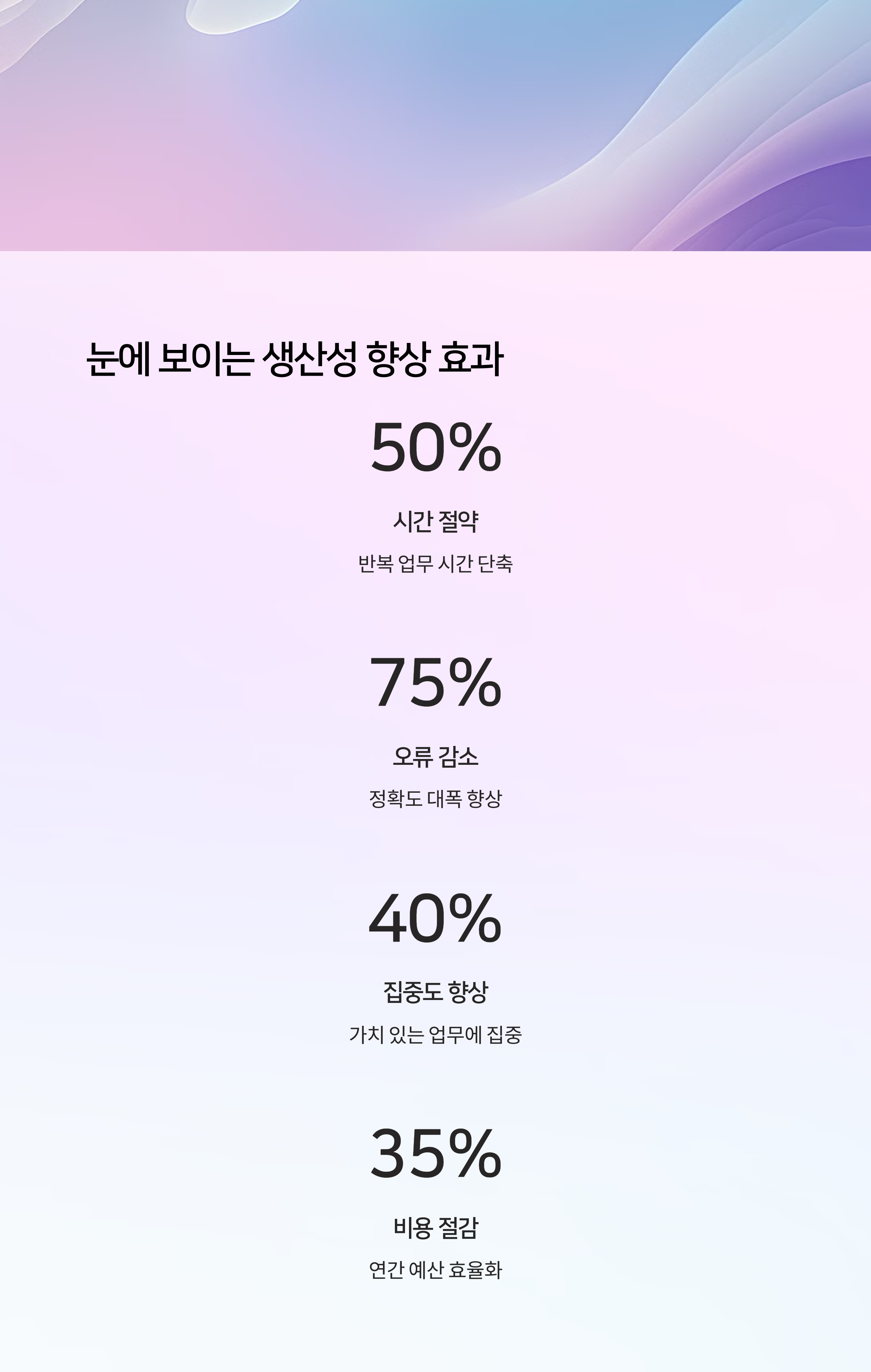 AI 자동화 툴 도입의 궁극적인 목적은 생산성 향상과 업무 혁신입니다. 단기적으로는 반복 업무를 줄여 효율을 높이고, 장기적으로는 인재가 창의적 업무에 집중할 수 있는 환경을 만드는 것이죠. 기업 문화와 조직의 디지털 역량을 고려하여 점진적 확산 전략을 택하는 것도 방법입니다. 또한 각 툴의 ROI 분석을 통해 비용 대비 효과를 측정하고 지속적으로 개선해 나가야 합니다. AI는 단순한 도구가 아닌, 업무의 동반자라는 인식을 갖는 것이 중요합니다.