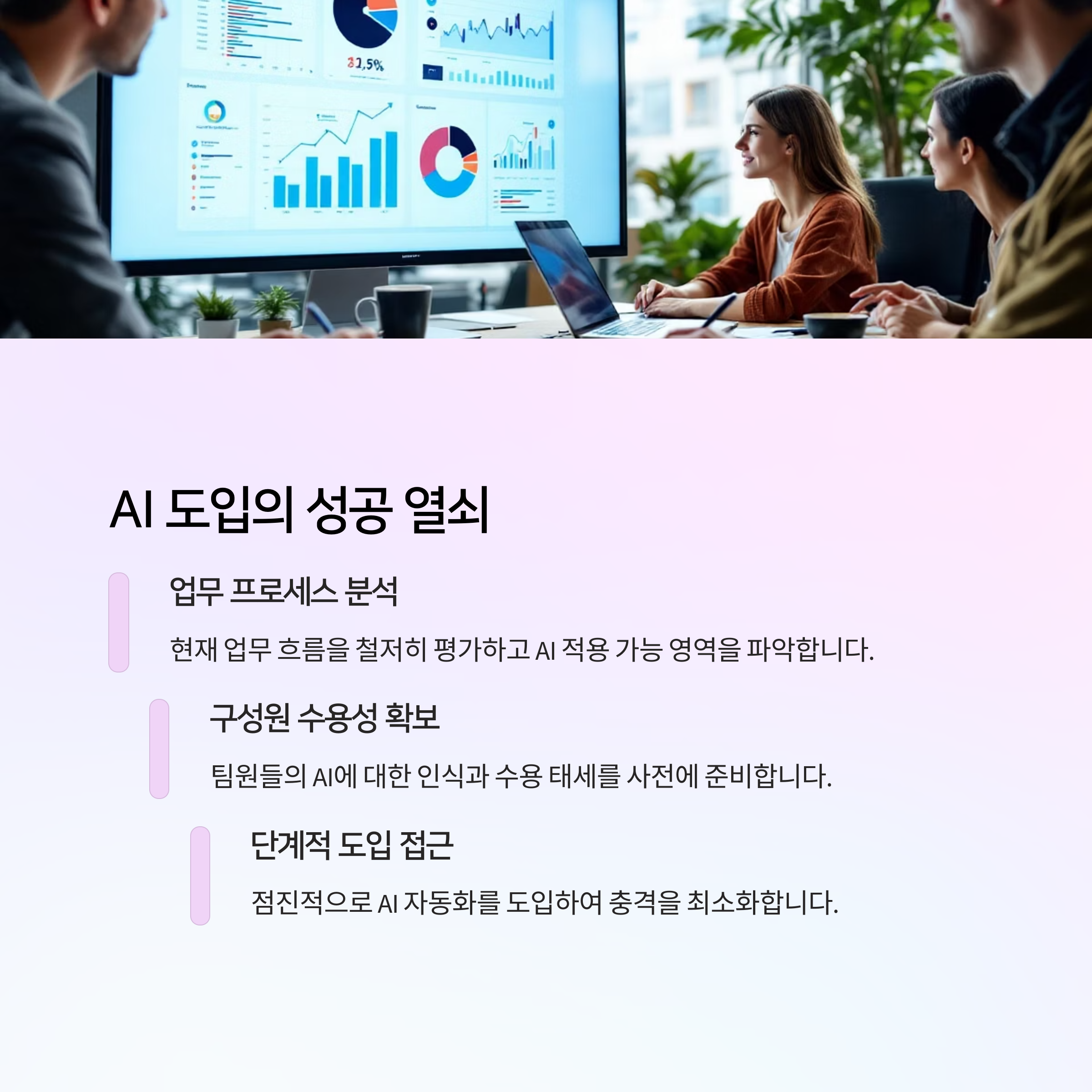 | AI 챗봇, 문서 요약 툴, 스케줄링 봇 등 | 구성원 수용도, 예산, 보안 문제 | ROI 개선, 지속적 혁신 가능성 확대 |