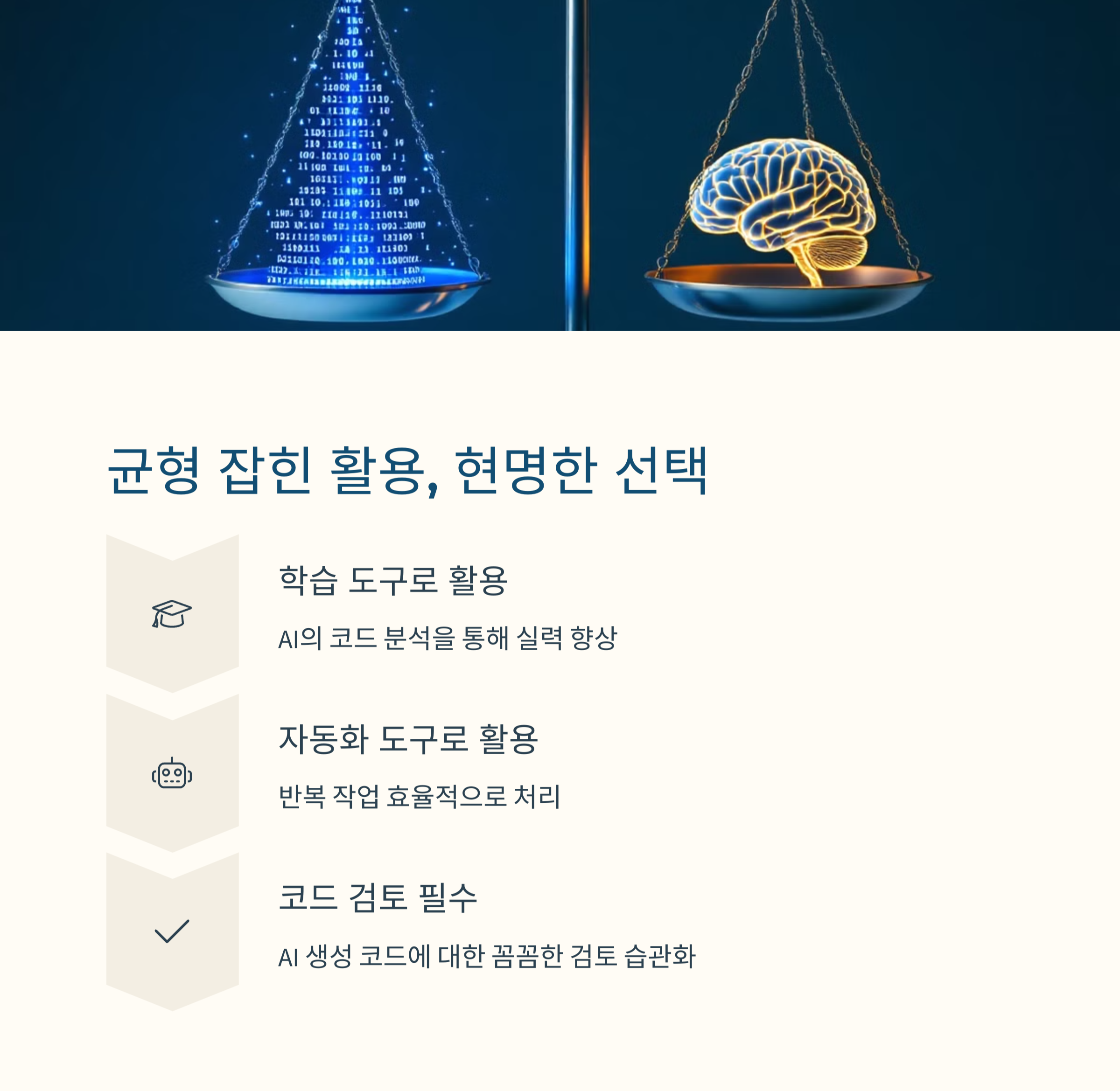 AI 코딩 도우미는 개발 환경에 혁신을 가져오고 있지만, 기술에 대한 의존과 통제 사이의 균형이 필요합니다. 도우미의 답변을 무조건 신뢰하기보다는 검증, 수정, 맥락 이해를 바탕으로 사용해야 하며, 지속적으로 개발자의 사고력과 문제 해결 능력을 함께 강화해야 합니다. 결국 AI는 사람의 역량을 확장시키는 도구일 뿐, 그 중심에는 여전히 개발자의 전문성이 존재합니다.