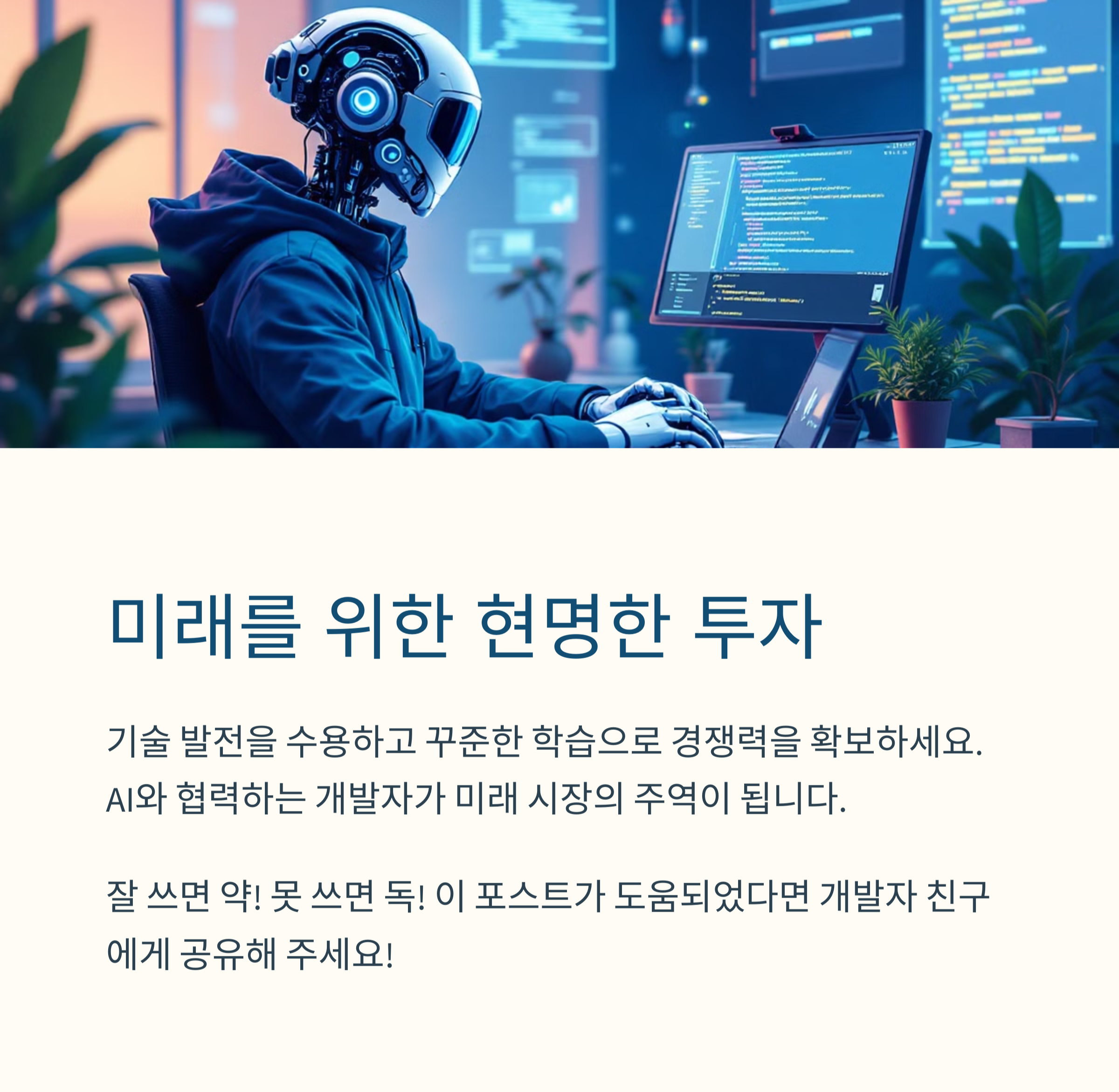 AI 코딩 도우미는 단순한 자동화 도구를 넘어, 개발자의 사고방식과 업무 방식까지 변화시키고 있습니다. 효율성, 속도, 접근성을 높여주는 동시에 기술에 대한 이해와 책임 있는 사용도 함께 요구됩니다. AI를 잘 활용하면 개발자는 더욱 창의적이고 전략적인 역할을 수행할 수 있게 됩니다. 이 변화의 물결 속에서 중요한 것은, 도구를 뛰어넘는 사람의 통찰력과 경험입니다.