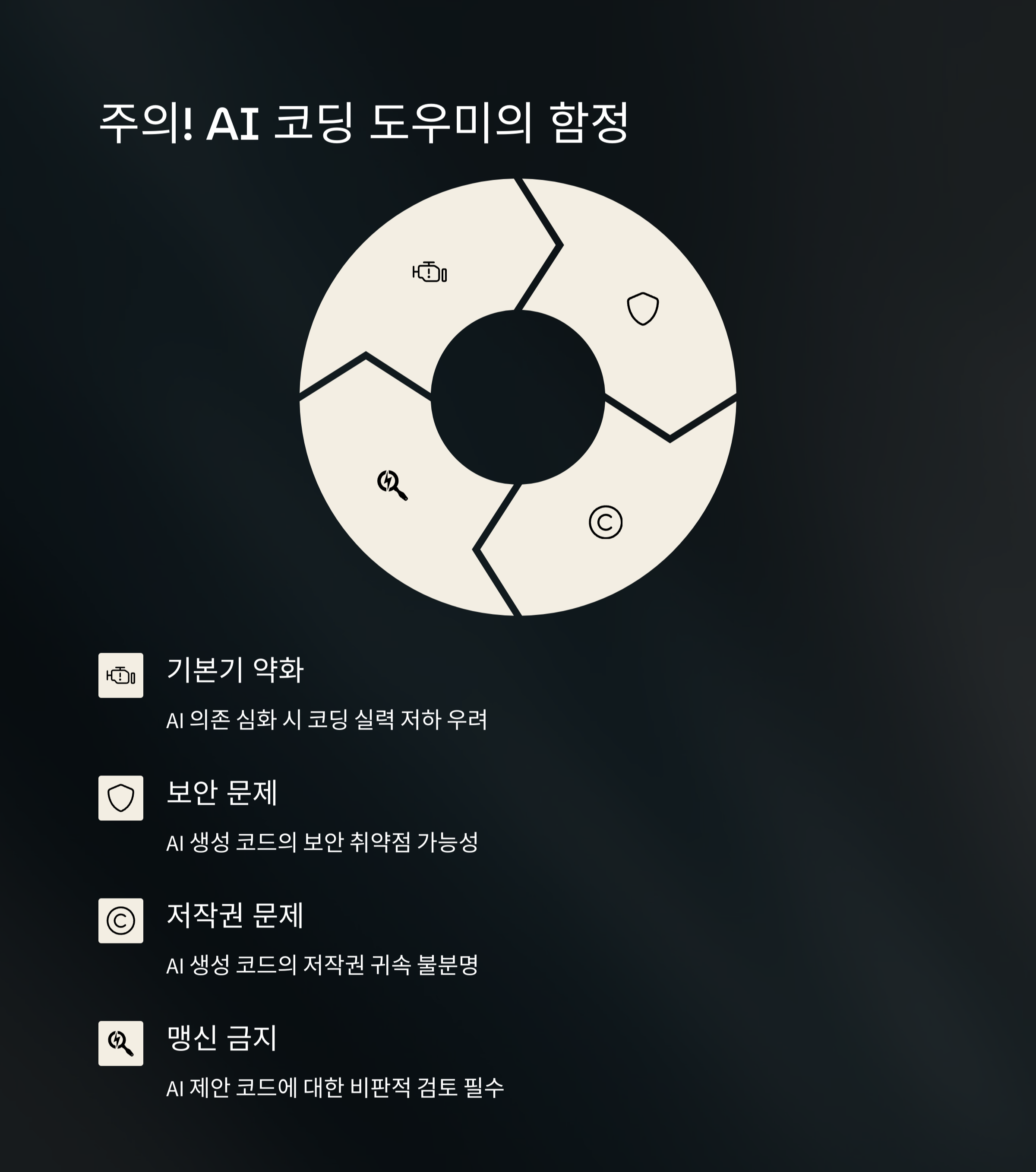하지만 모든 것이 긍정적인 것만은 아닙니다. AI 의존도가 높아질수록 기본기 부족 문제가 우려되며, 실제 코드 구조를 깊이 이해하지 못한 채 결과만 빠르게 얻으려는 접근이 늘어날 수 있습니다. 또한 보안상 민감한 코드의 노출 가능성, 생성된 코드의 품질에 대한 신뢰 문제도 존재합니다. AI를 제대로 활용하기 위해서는 개발자의 판단력과 책임감이 필수적이며, 이를 기반으로 도우미를 효율적으로 활용해야 진정한 시너지가 발휘됩니다.