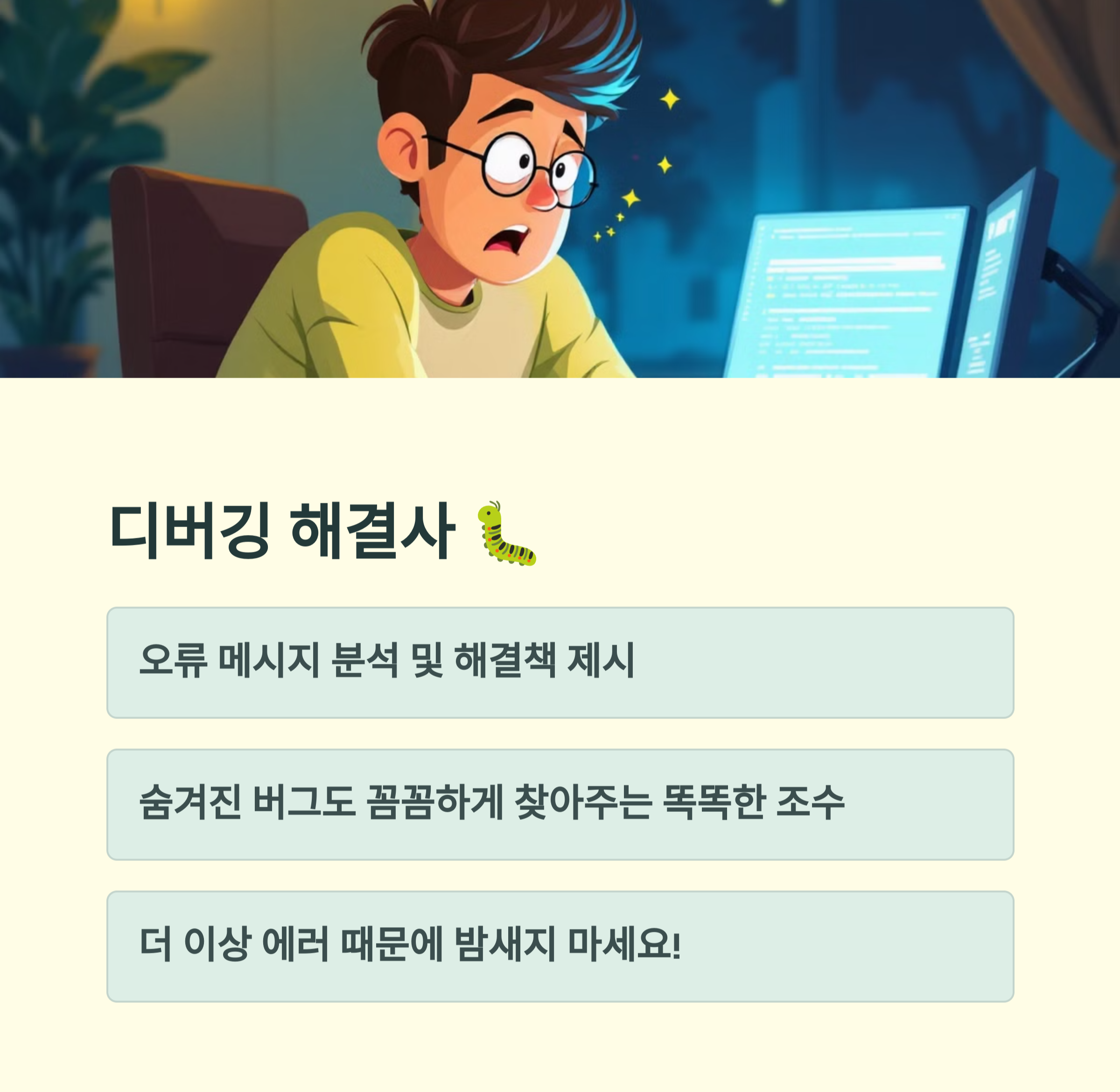 | 자연어 프롬프트로 코드 및 문서 생성 | 플러그인 및 확장 도구로 자동화 구성 | 실시간 도움, 디버깅, 리팩토링 지원 |