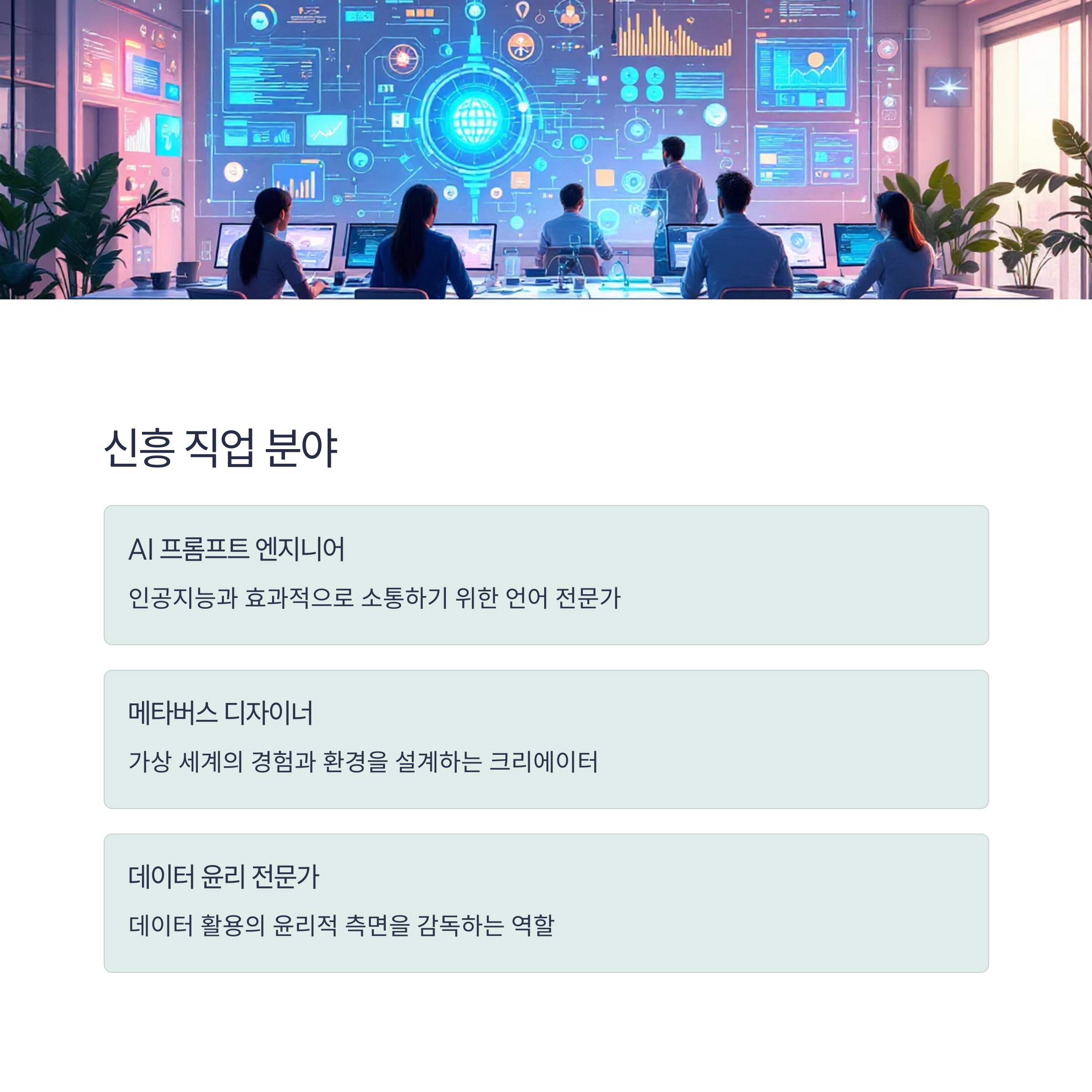 | 자동화, 인공지능, 메타버스 기술의 확장 | AI 윤리, 데이터 분석, 메타버스 디자이너 | 융합 사고, 소통 능력, 기술 적응력 |