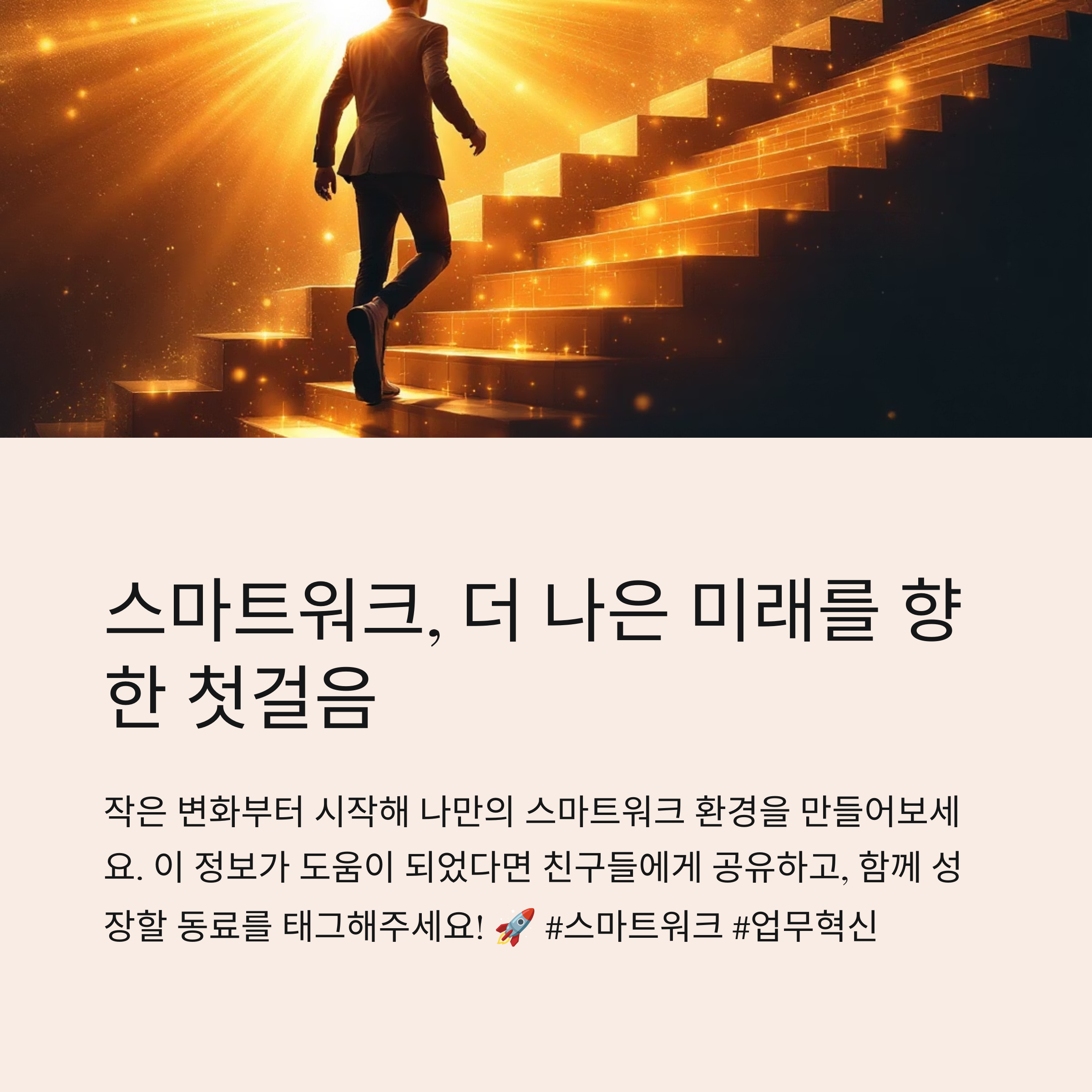 스마트워크는 단순한 기술 트렌드를 넘어 더 효율적이고 지속가능한 업무 방식으로 자리잡고 있습니다. 완벽한 시스템을 한 번에 만들기보다는, 작은 변화부터 시작해 점진적으로 체계를 잡아가는 것이 중요합니다. 본문에서 소개한 다양한 도구와 적용 사례를 참고하여 지금 바로 여러분의 업무 환경을 재정비해보세요. 나만의 스마트워크 스타일을 만들면, 업무 스트레스는 줄고 여유는 늘어납니다. 지금이 변화의 적기입니다.