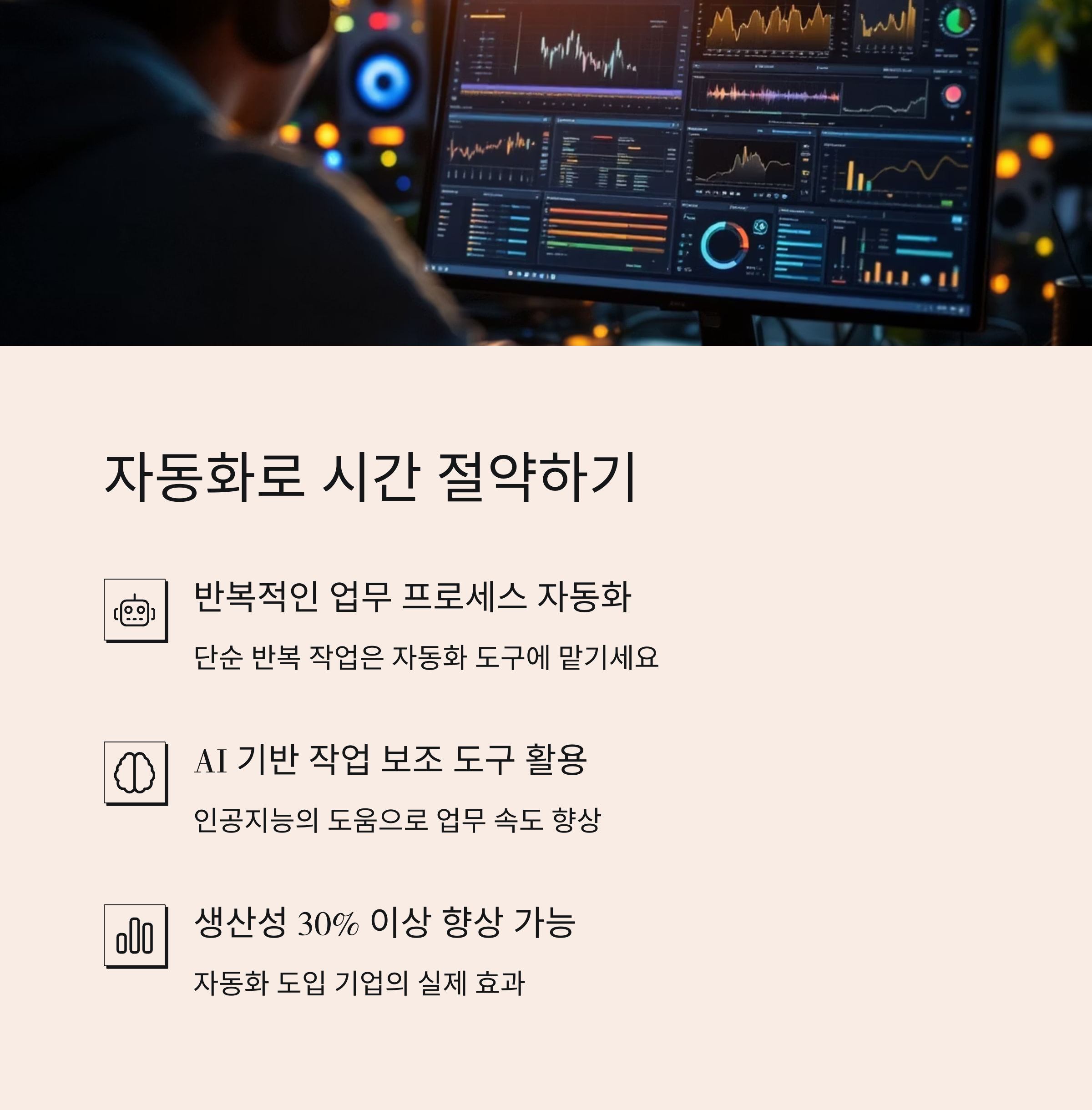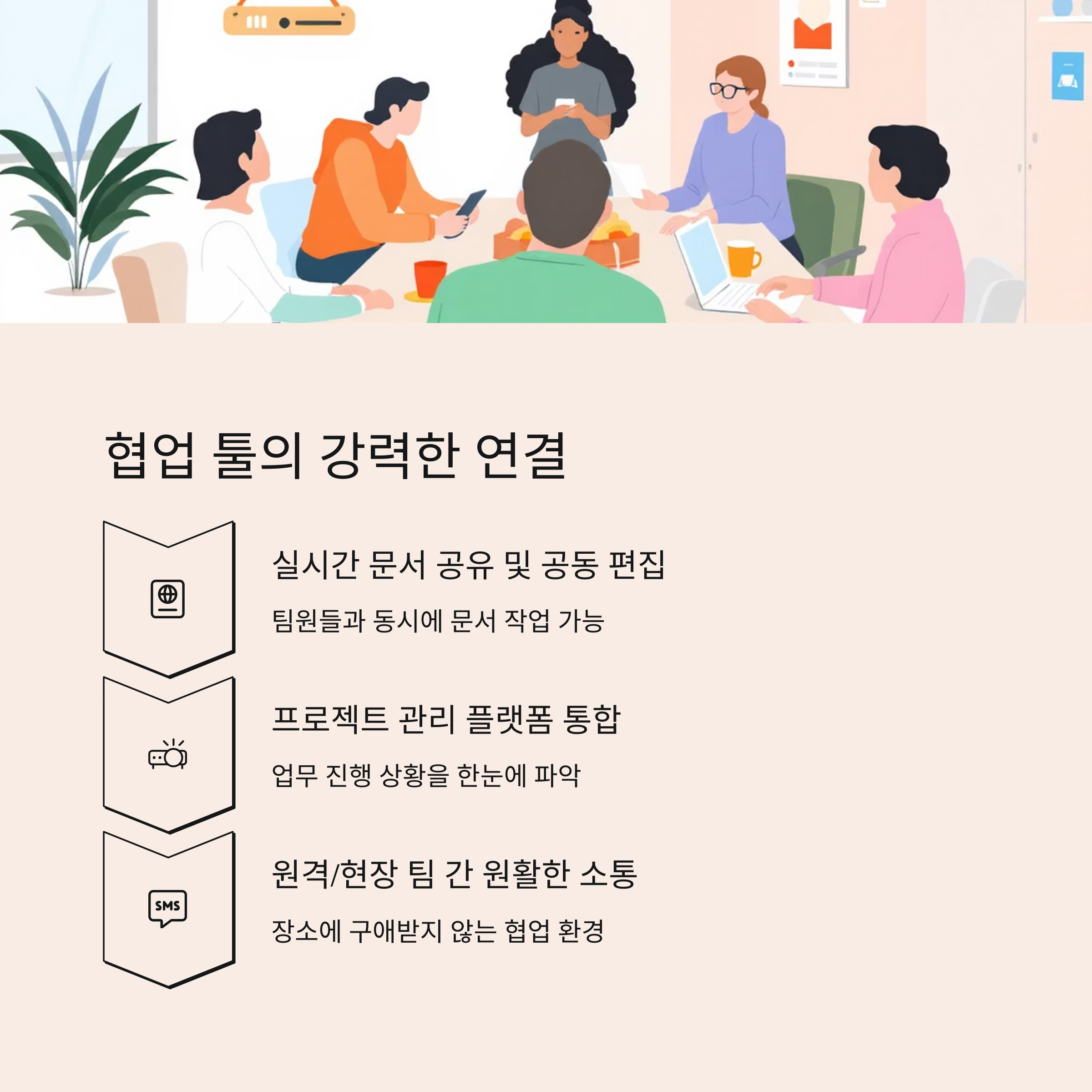 Zapier, Make, IFTTT 등 반복 업무 자동화 | Notion, Slack, Trello로 협업 효율 증대 | Google Drive, Dropbox 등 파일 관리 용이 |