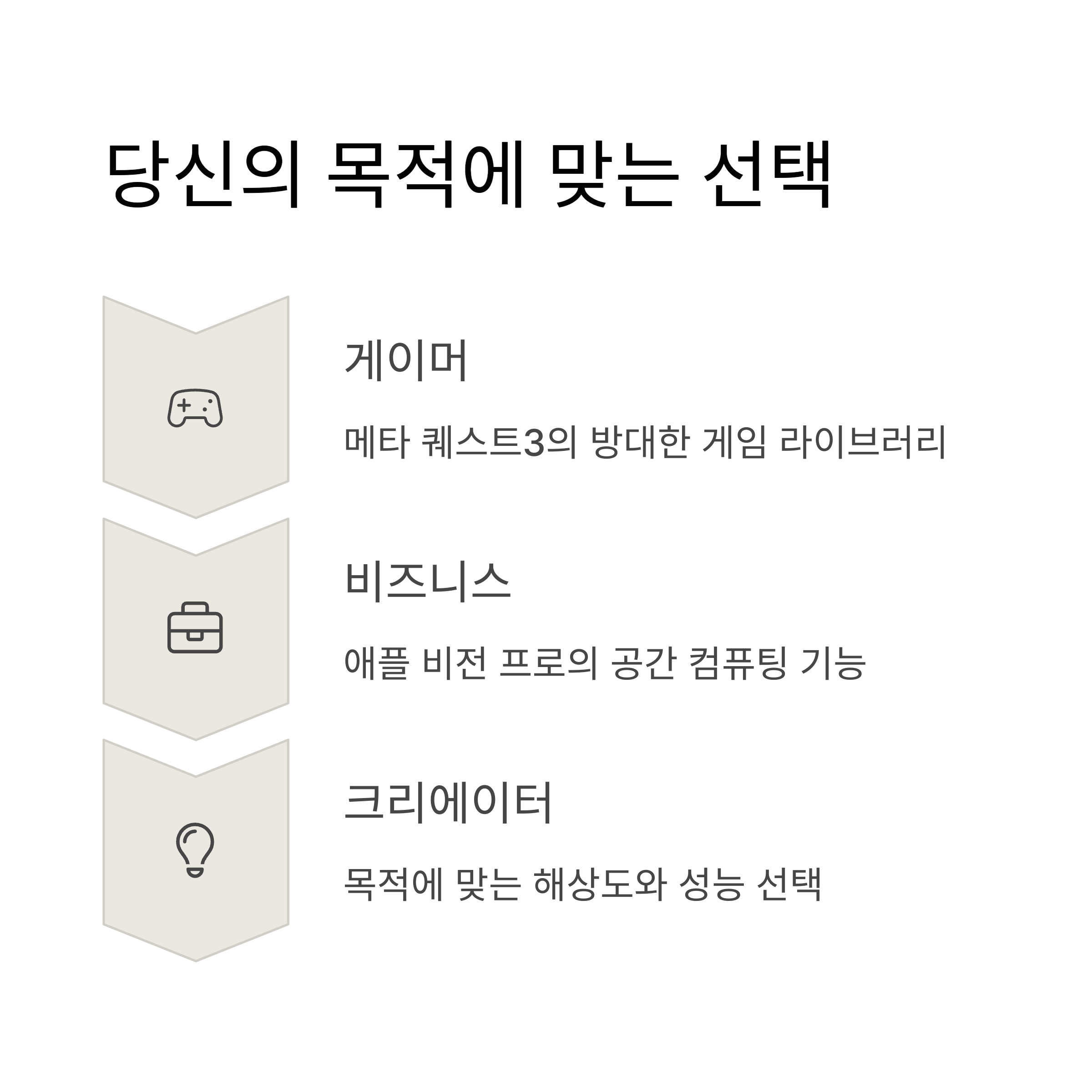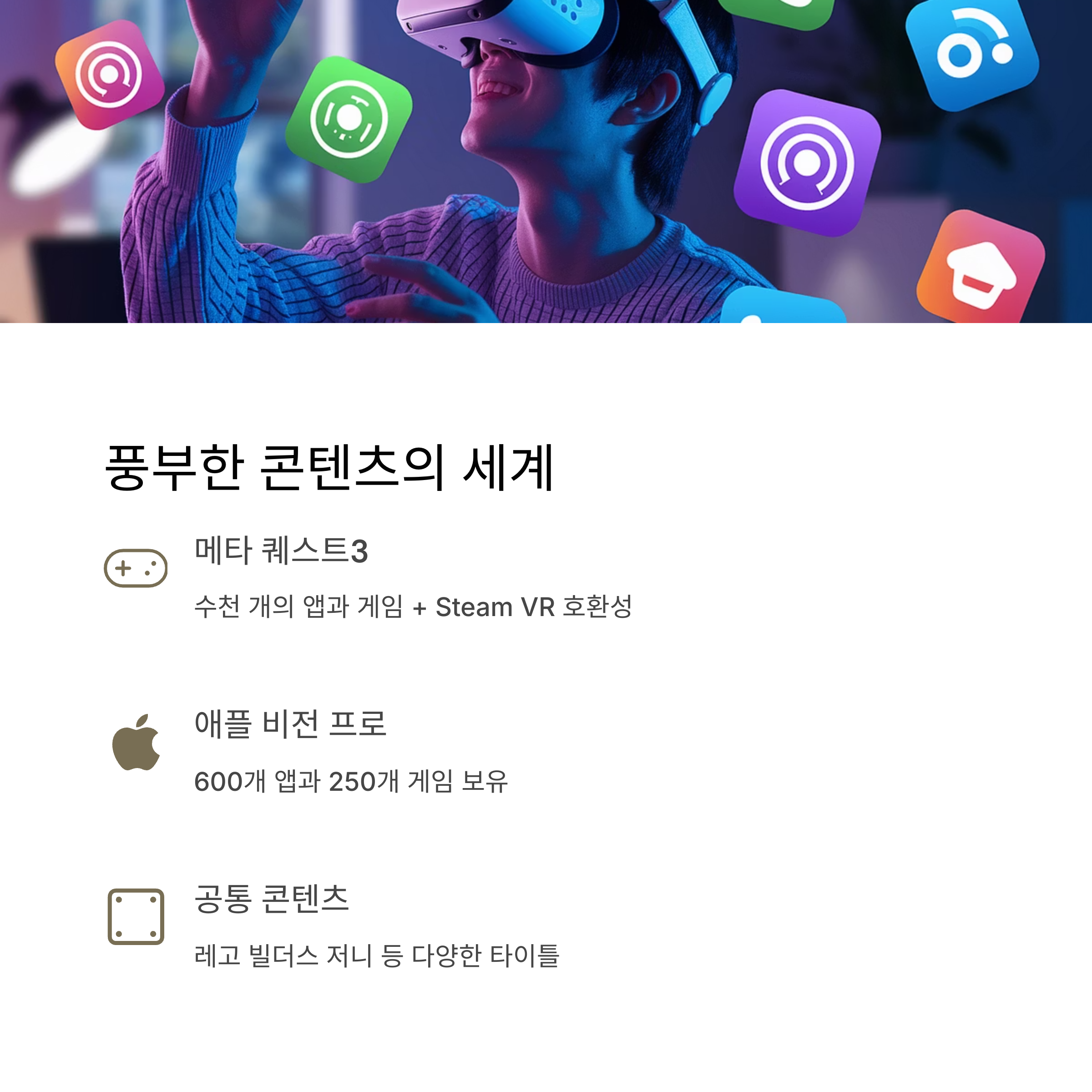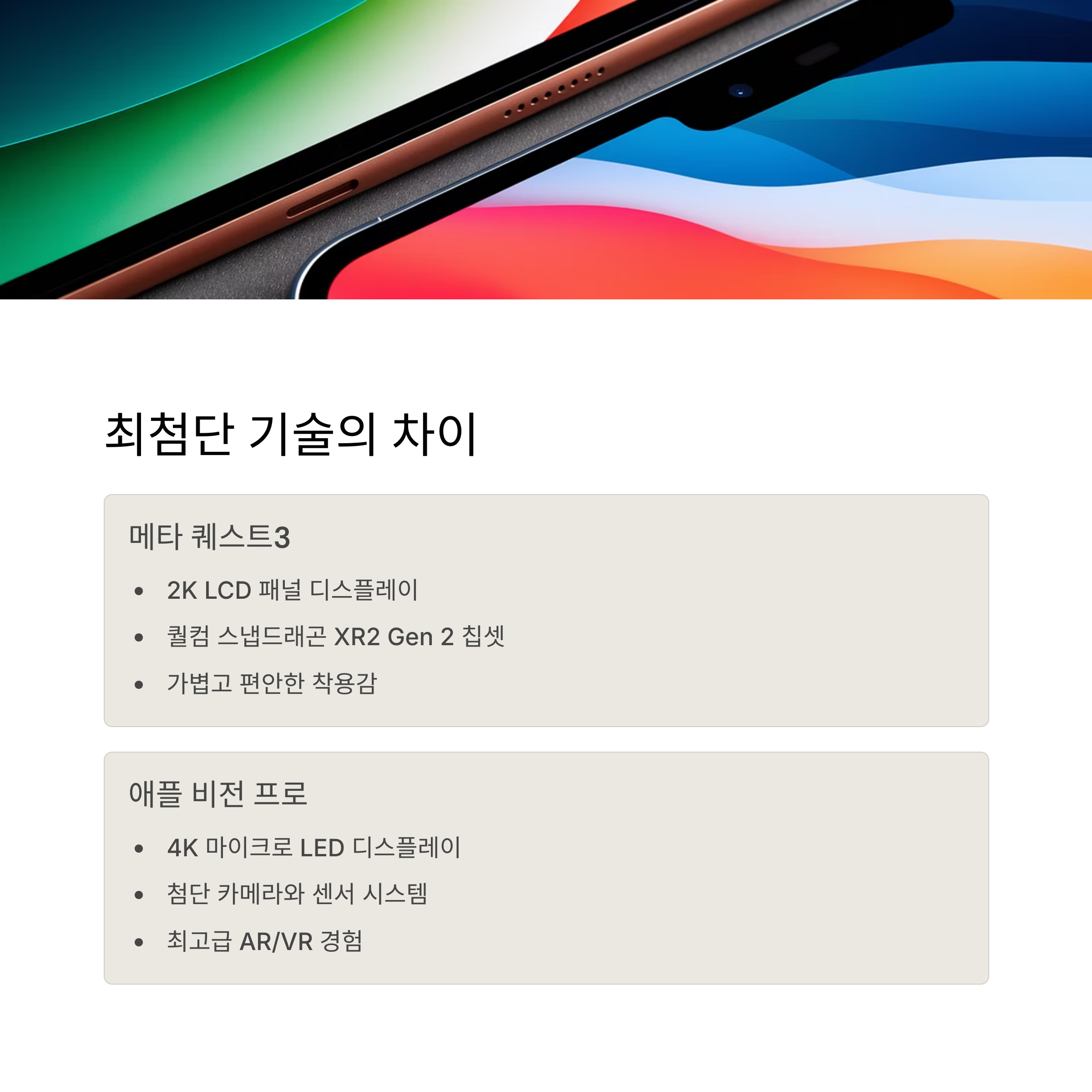 예산이 제한적이거나 게임, 피트니스 등 콘텐츠 위주 사용 목적이라면 메타가 유리하고, 업무 연동, 몰입형 경험을 원한다면 애플이 좋습니다.